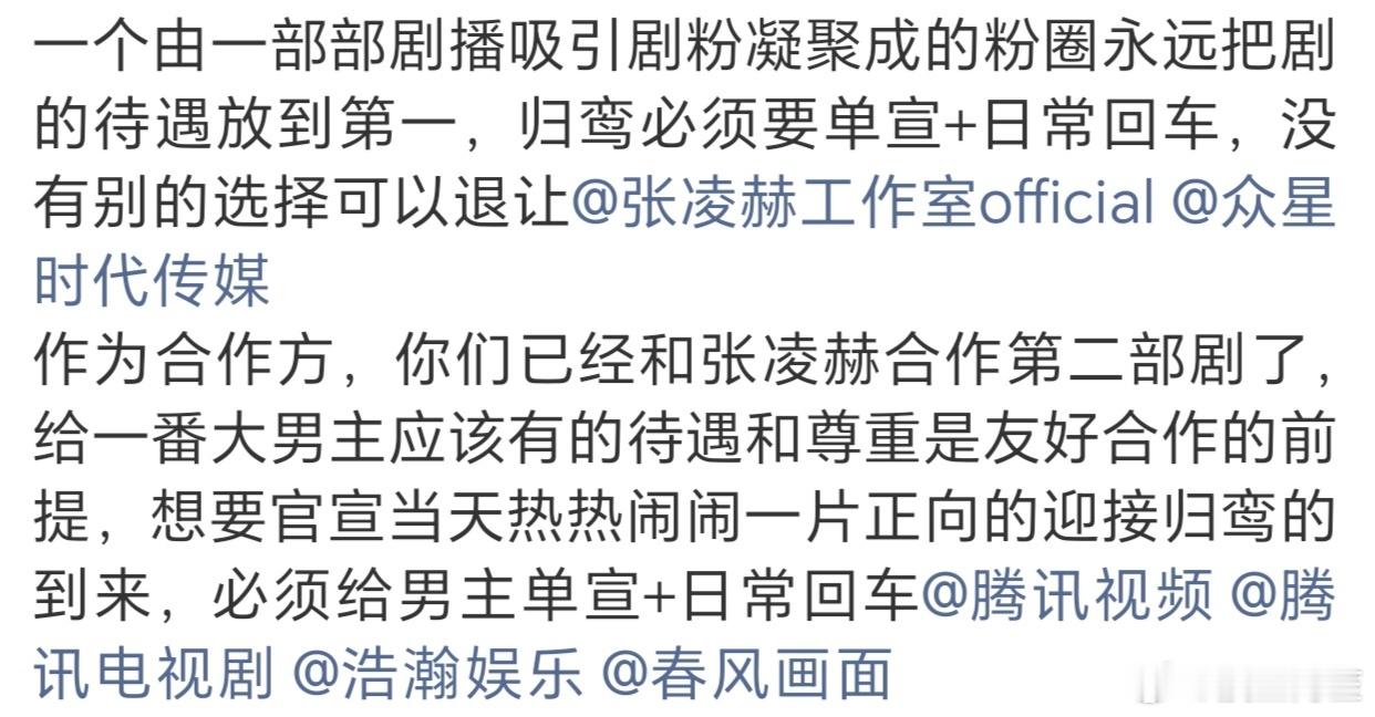 既然《归鸾》是靠张凌赫过会拉投资的话,人家粉丝要求官宣给出态度和排面也是正常的要