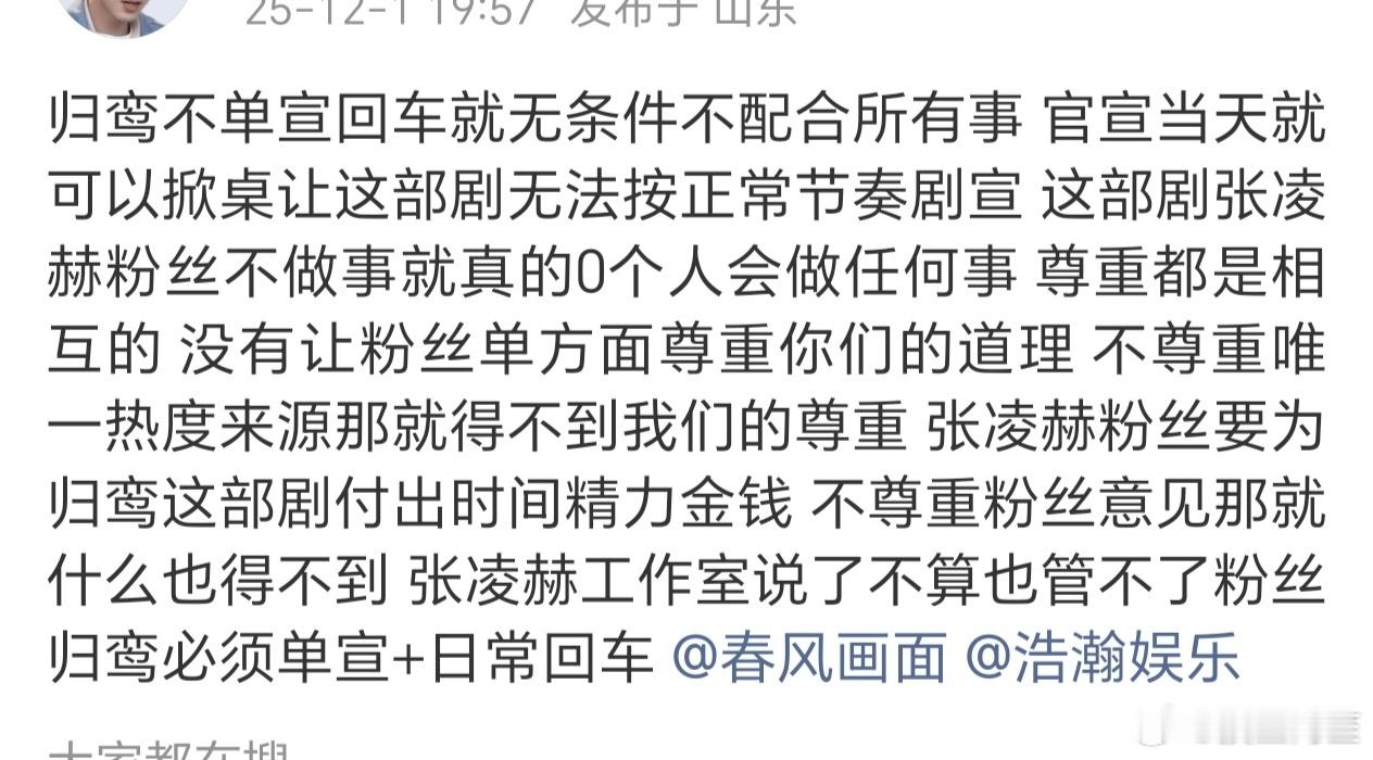 既然《归鸾》是靠张凌赫过会拉投资的话,人家粉丝要求官宣给出态度和排面也是正常的要求。