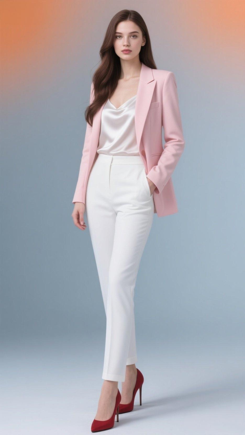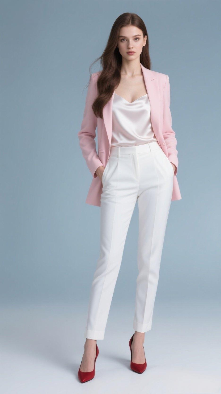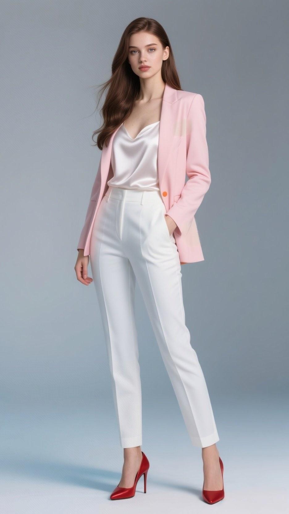 职场穿搭也能玩出新花样,粉色西装搭配白色内搭和裤子,再配上红色高跟鞋,这组合简直绝了! 粉色西装选带灰调的柔粉和哑光面料,黄皮人穿也能有冷白皮效果。微阔肩的设计,用直线条中和了粉色的柔美,不会显得过于甜腻。内搭一件真丝白衬衫,瞬间提升专业度。下身搭配白色裤子,简洁又大方。红色高跟鞋更是点睛之笔,不仅增加了时尚感,走起路来还自带气场。 这样的穿搭去职场,既时尚又干练,绝对能让你在人群中脱颖而出。