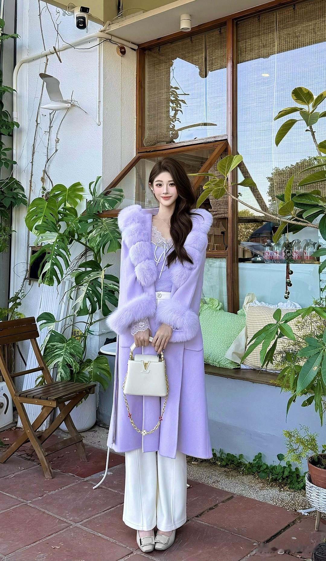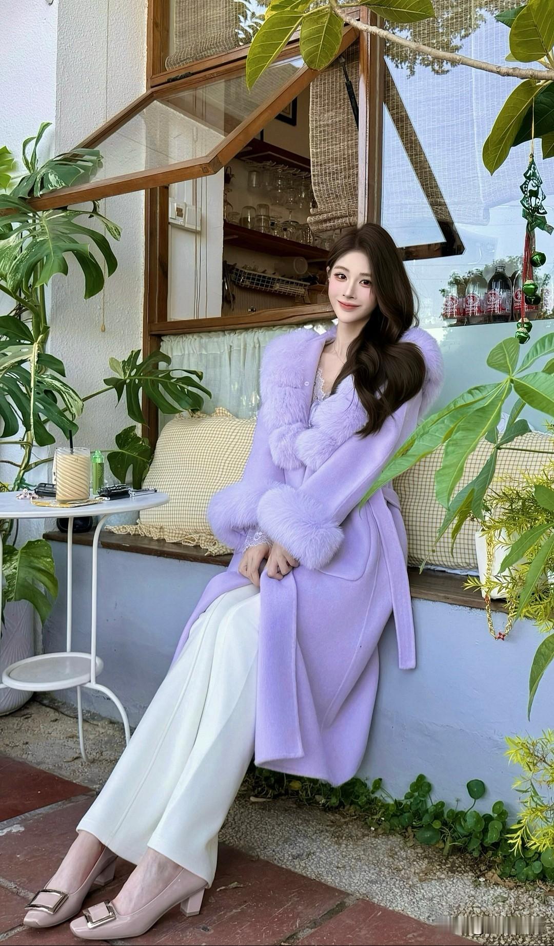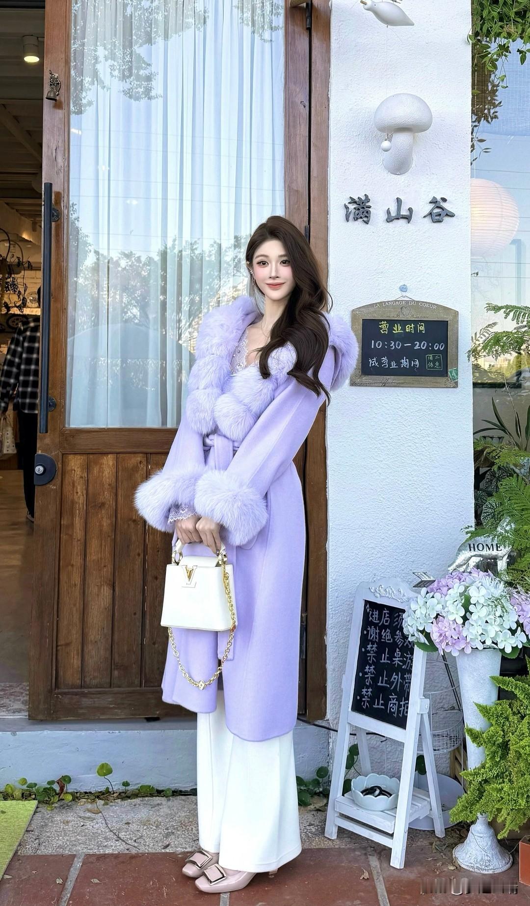 冬日暖阳下,浅紫色毛绒大衣搭配白色长裙,优雅动人。