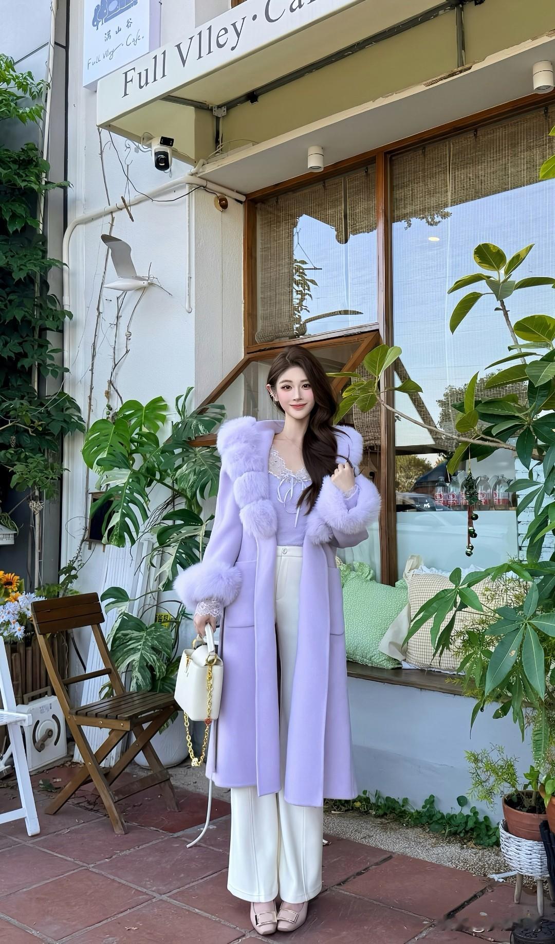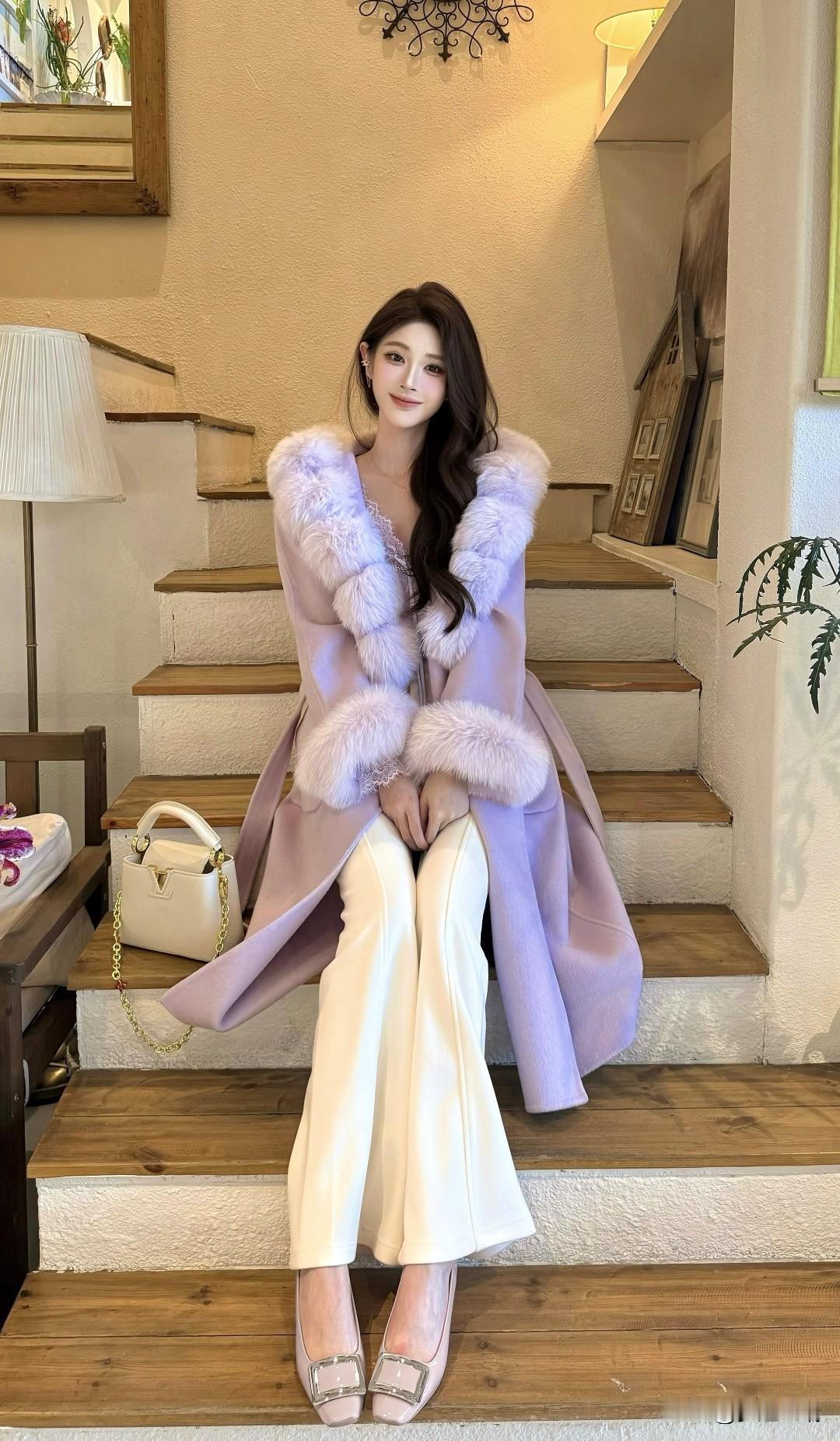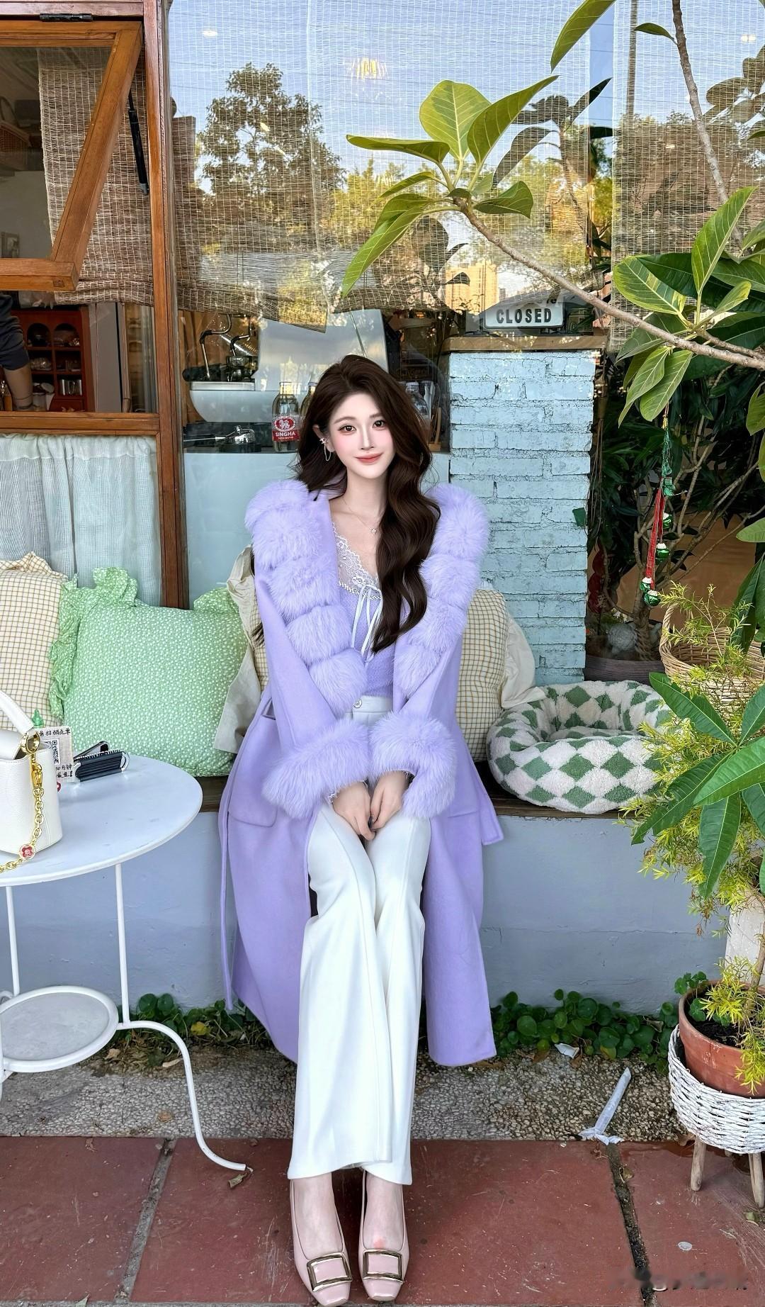 冬日暖阳下,浅紫色毛绒大衣搭配白色长裙,优雅动人。