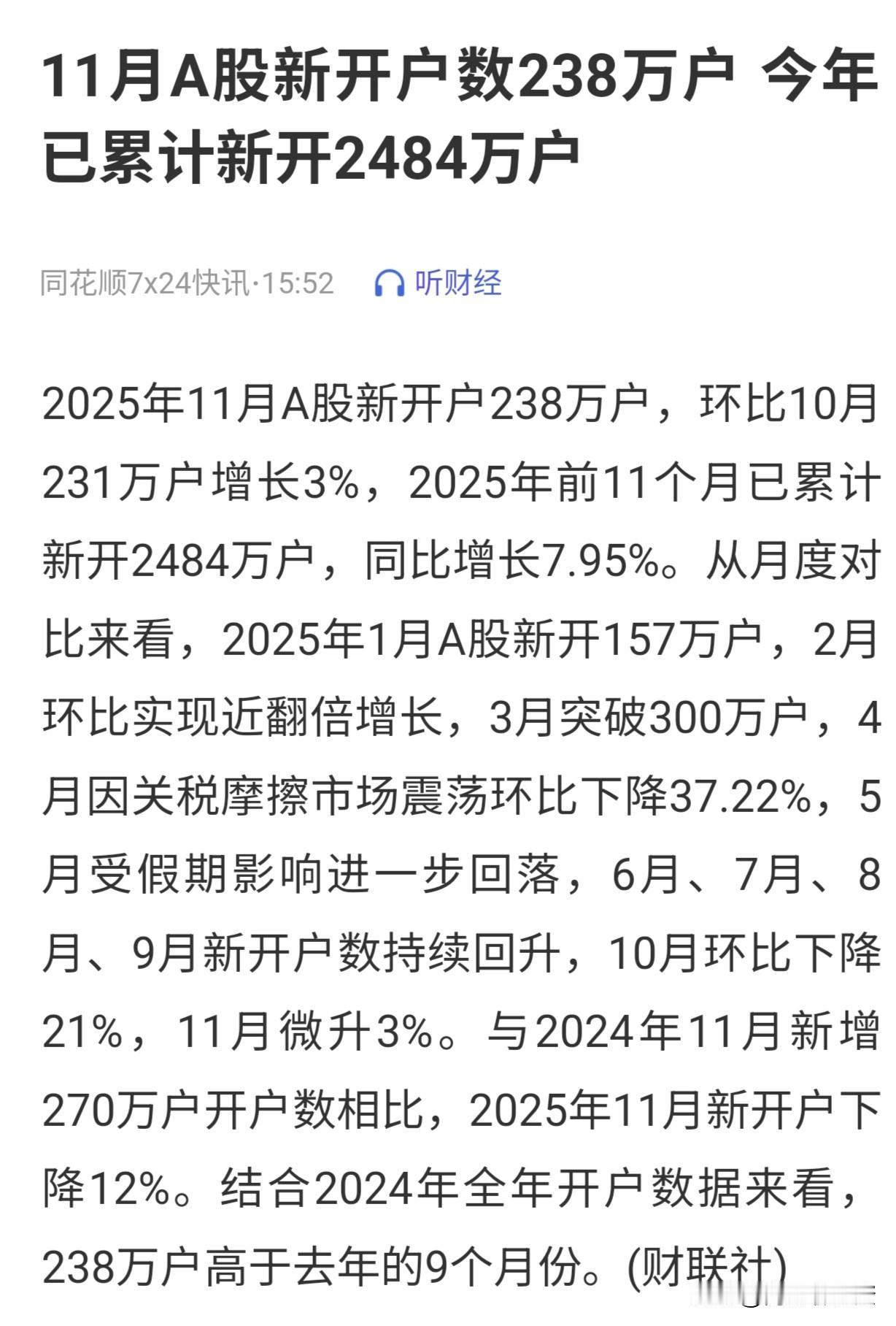 我的天! 今年以来已经新增开户数量2484万,11月开户238万 假设平均每个人都带着以下的资金入市 2484×1万=2484亿 2484×2万=4968亿 2484×5万=1.24万亿 2484×10万=2.484万亿 算着挺多的,实际上并不多! 说明距离牛市或者全面牛市,还早的很,股市没有赚钱效应,就不会吸引人。