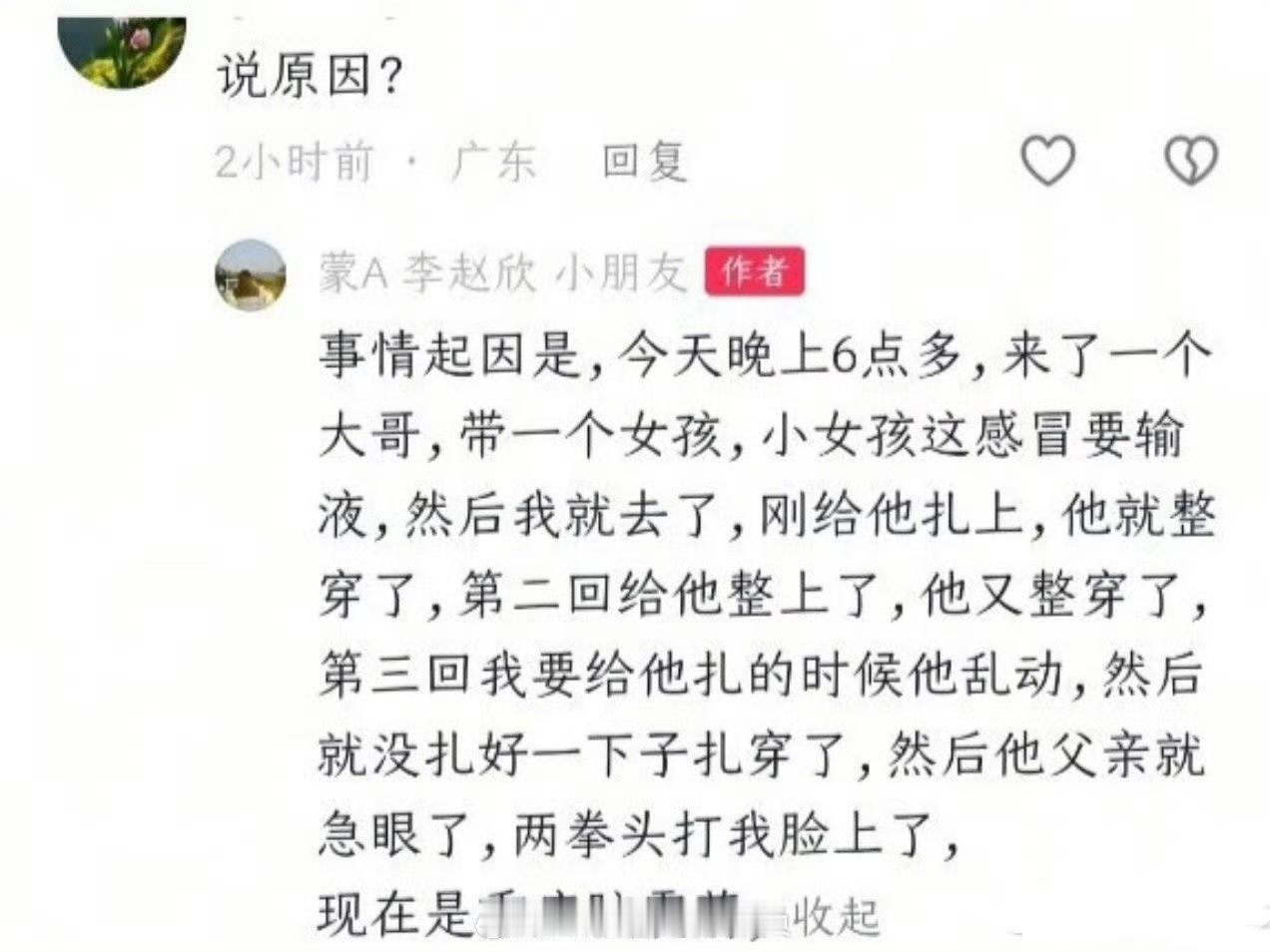 姑娘勇敢起诉吧,河北一医院护士被患者家属重拳殴打。事情起因是护士给孩子输液,连续两次因为孩子乱动不配合,导致针管整穿了。第三次,孩子还是因为怕疼不配合整穿了。孩子的爹就不干了,认为护士技术不行,不由分说对着护士头部猛击2拳,导致脑震荡,太阳穴骨裂,耳膜出血,下巴脱臼,这是非常严重的伤了,足够他坐牢,别和解。殴打事件 殴打伤人