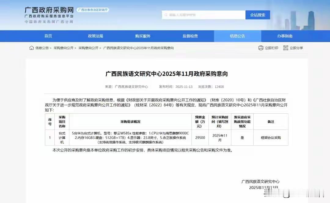 某单位采购被曝出5台电脑花费近3个亿,当地对此进行了回应。 广西某单位计划采购5台华为台式电脑,标注的预算金额为29500万元,该事引起了网友们的质疑。 有好心的网友查询了同型号的电脑在网购平台上的价格,满打满算也不会超过1万元,这就有问题了,而当地的工作人员回应称,这可能是因为价格标错了。 网友说幸亏有人查看了采购公告,如果不是有人提出质疑,可能就成真了。