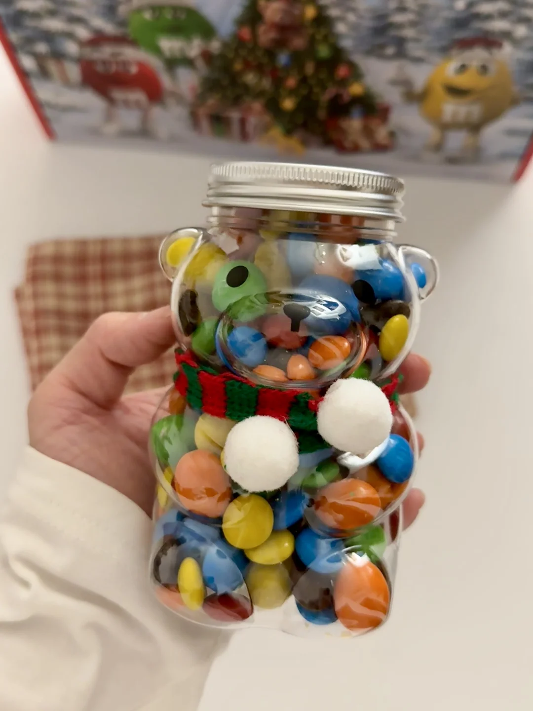 往里面倒入满满的M豆 就可以拥有一个可爱的圣诞糖豆小熊罐