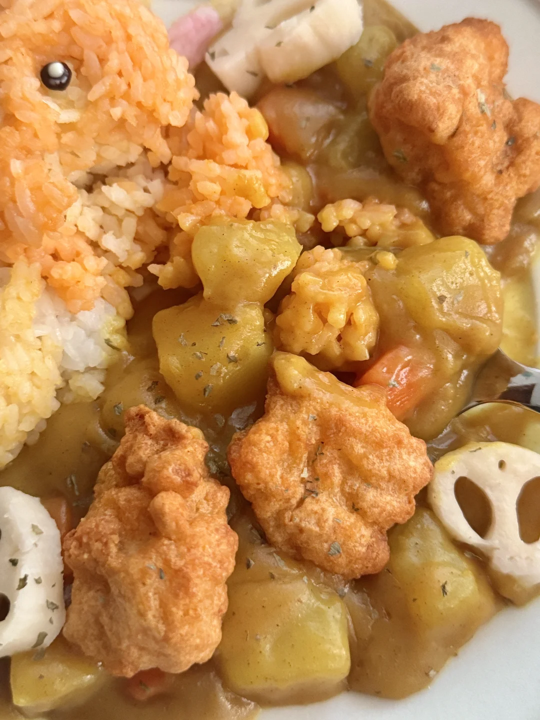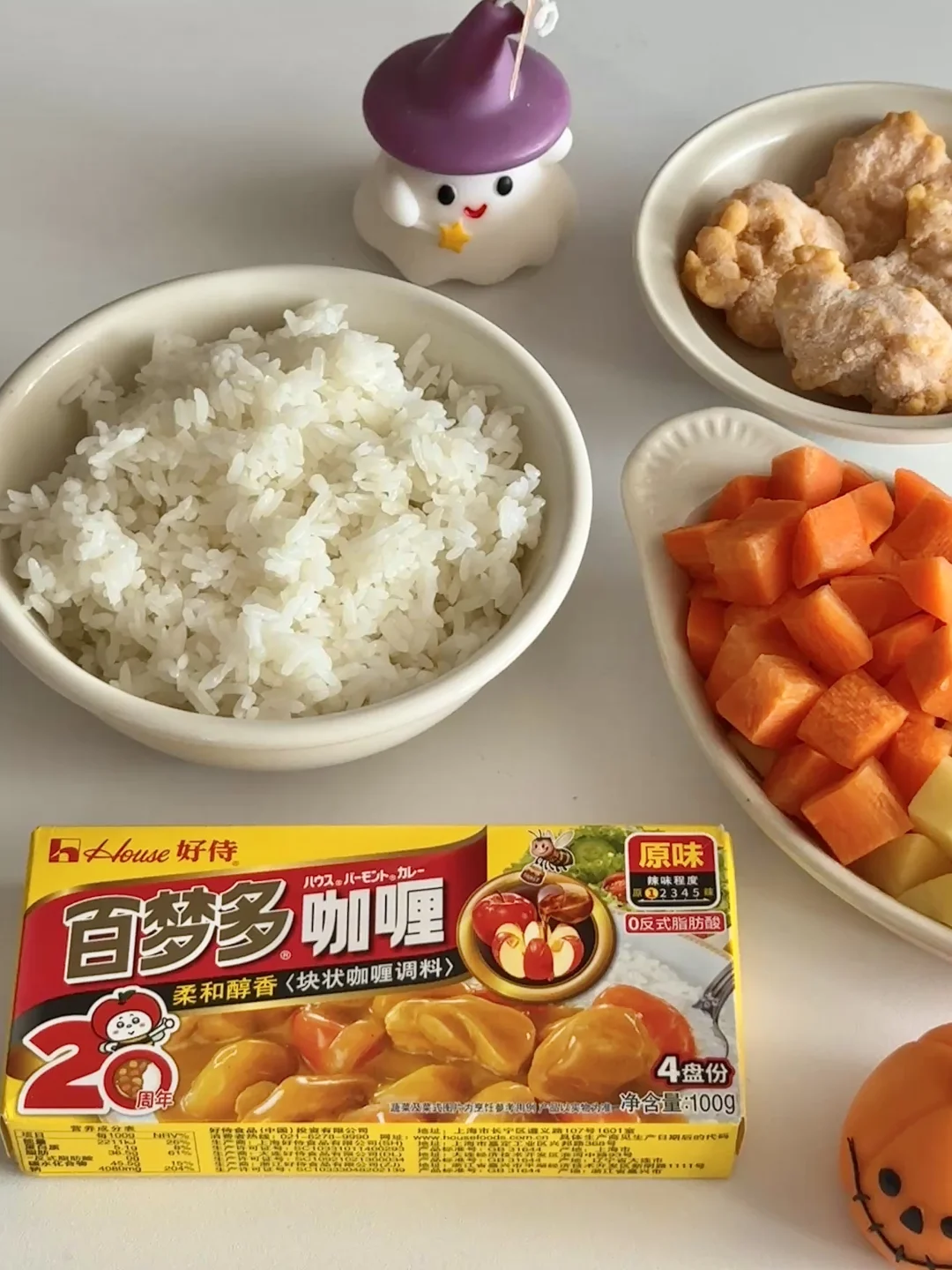 好侍百梦多咖喱、胡萝卜、土豆、莲藕、米饭、炸鸡块