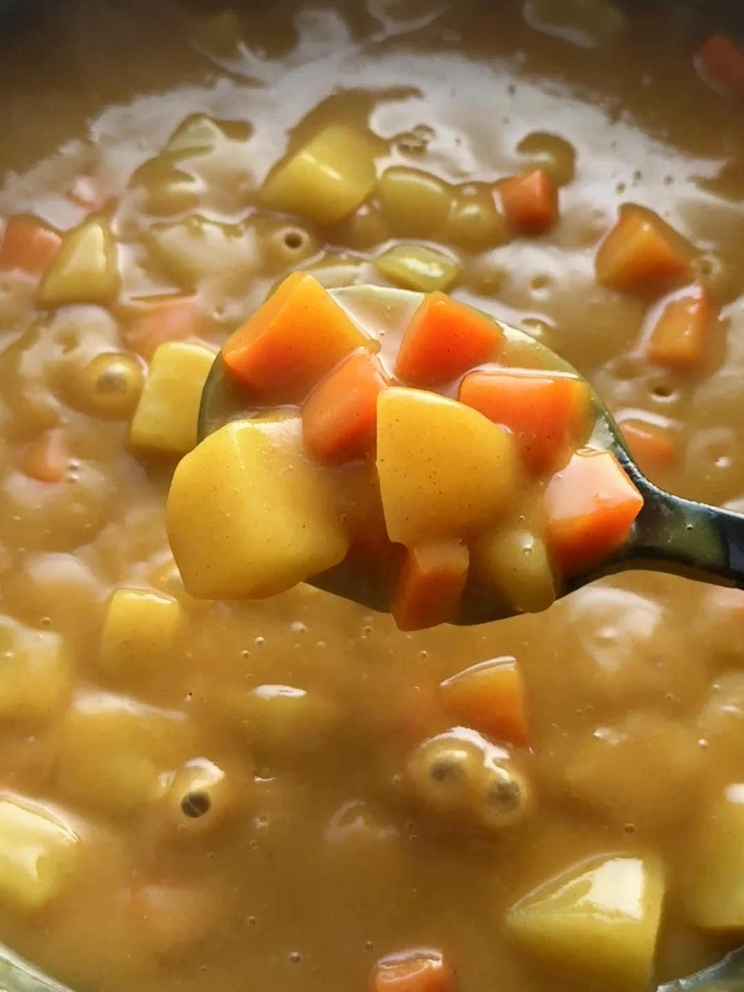 1️⃣热锅冷油,先把土豆和胡萝卜炒软,加入没过食材的清水,盖盖煮到食材熟软(烹饪时无需添加其他调料)