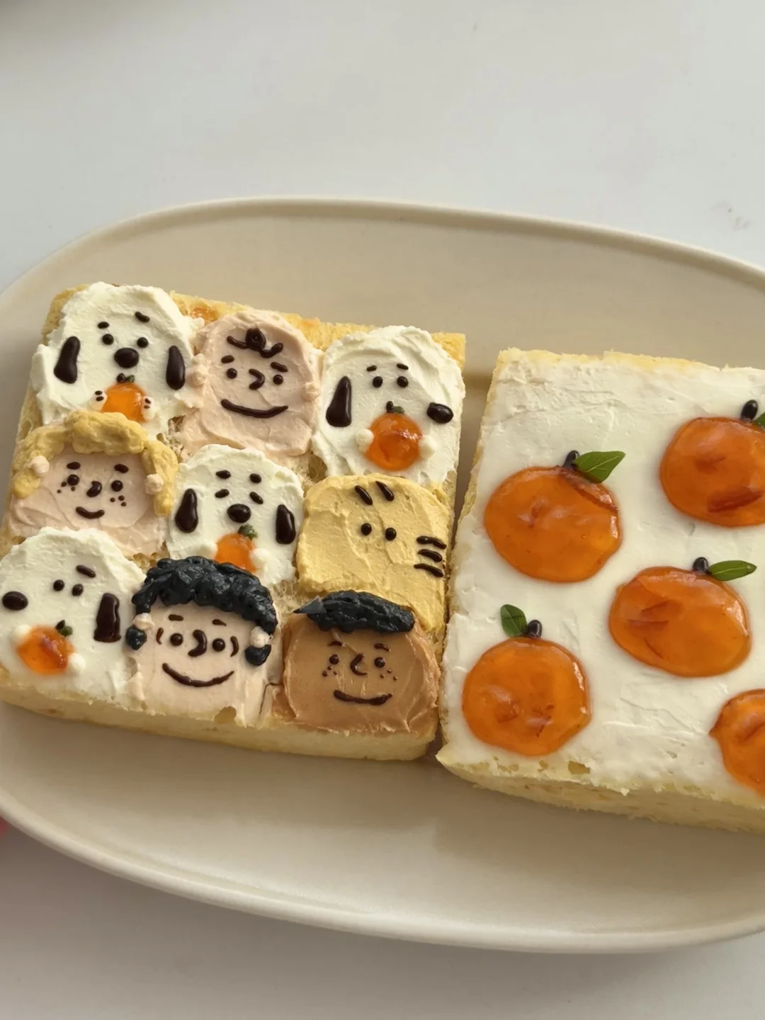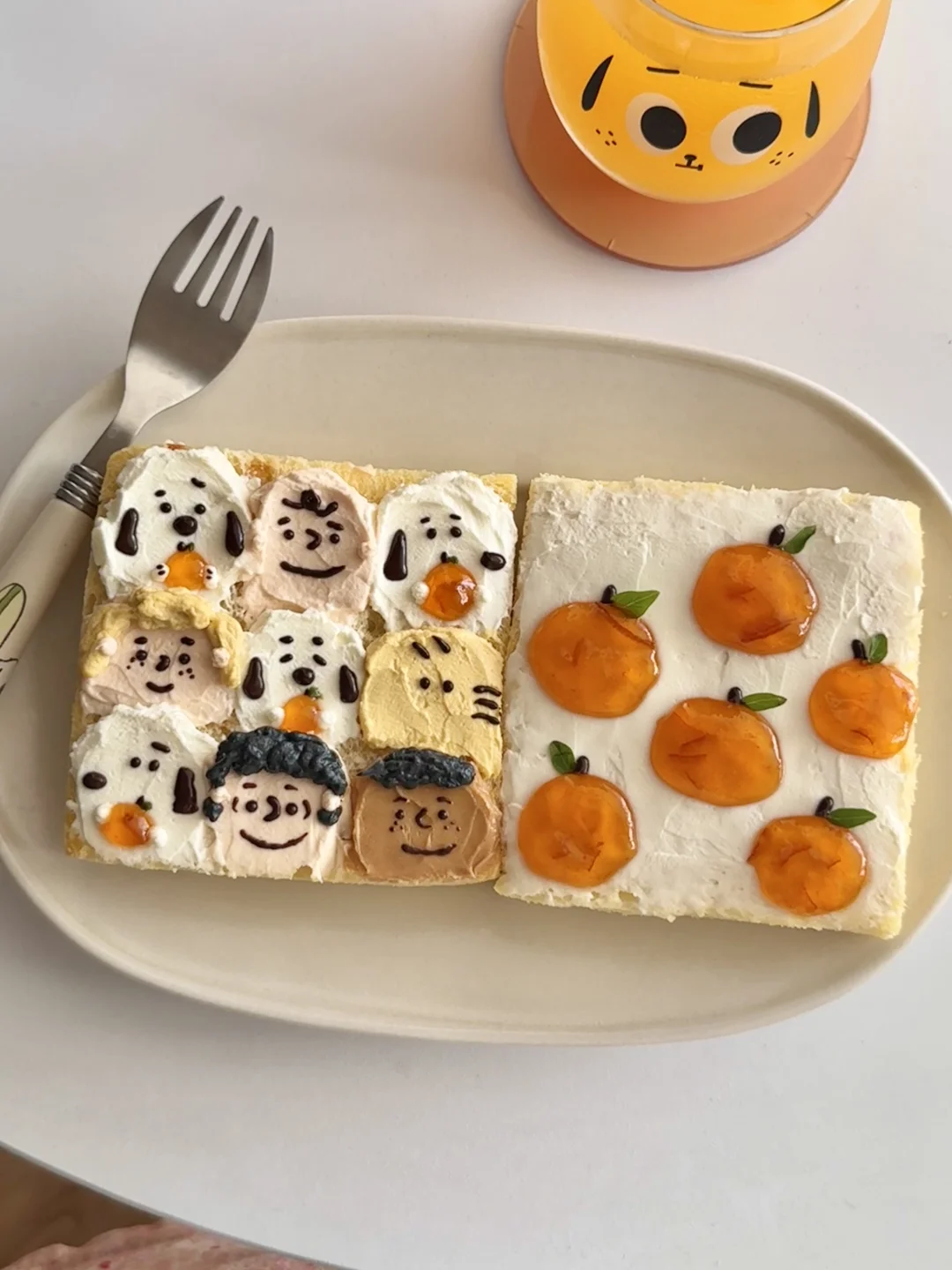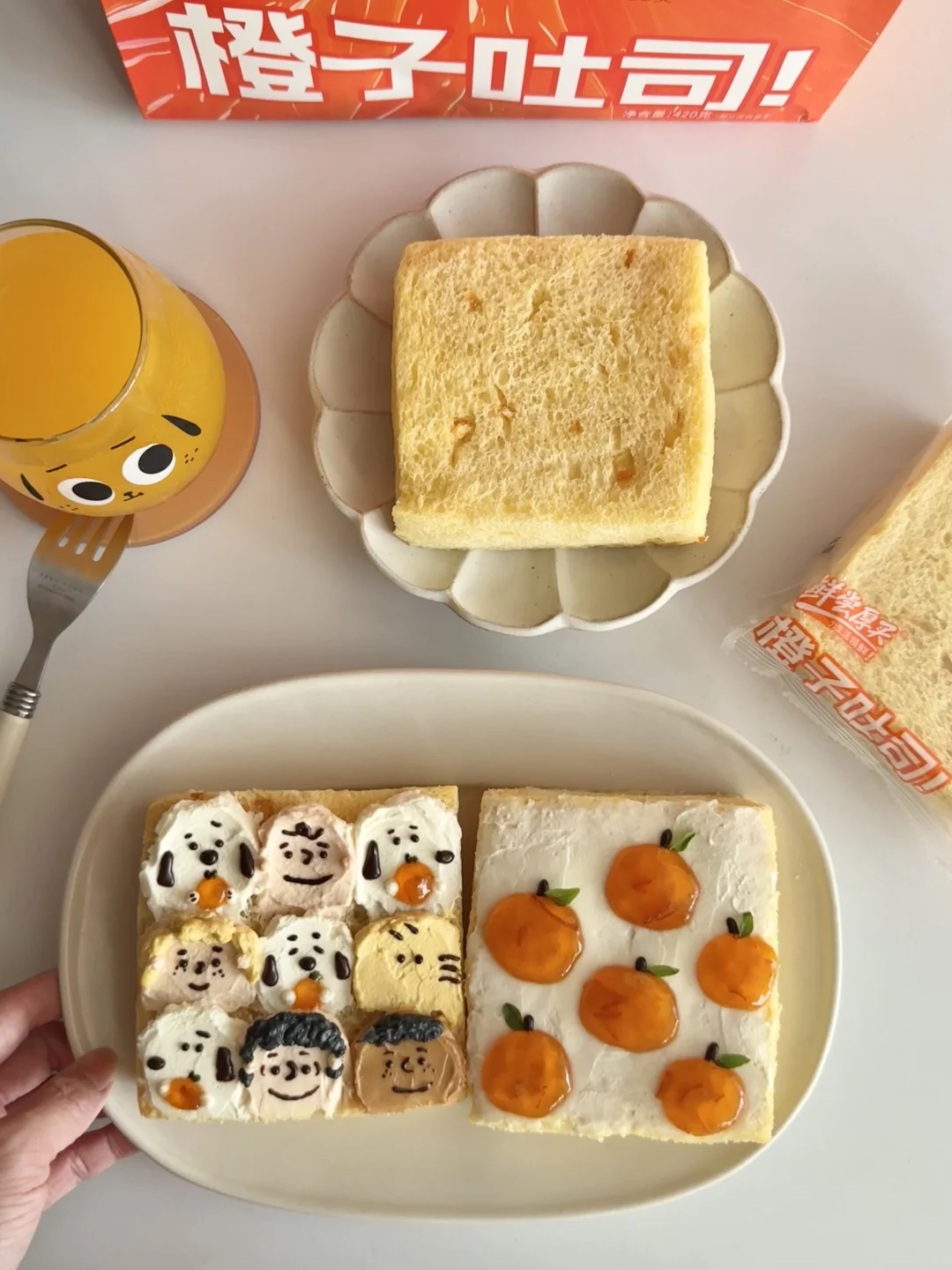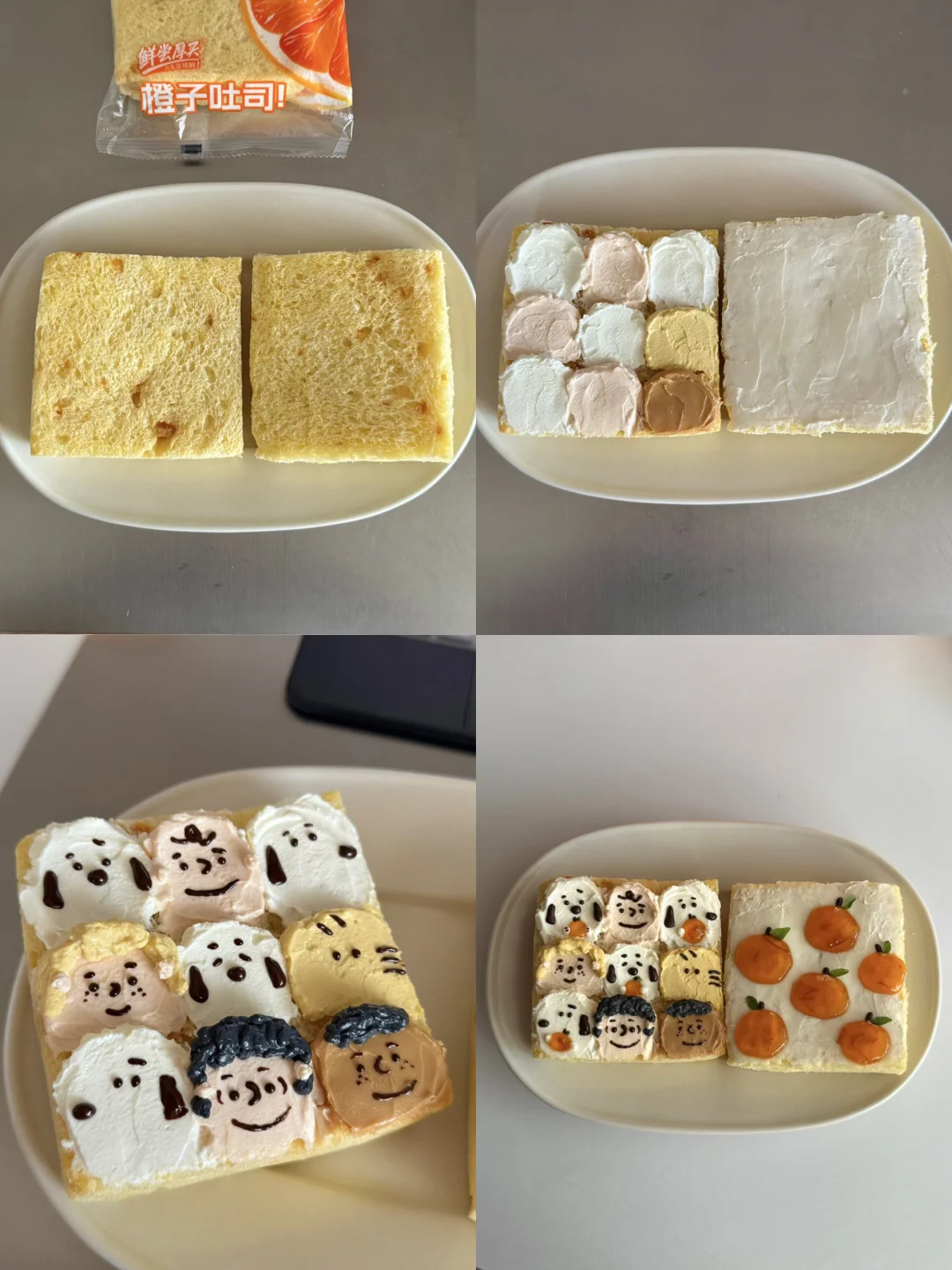 厚厚的橙子吐司抹上可爱的史努比奶酪~