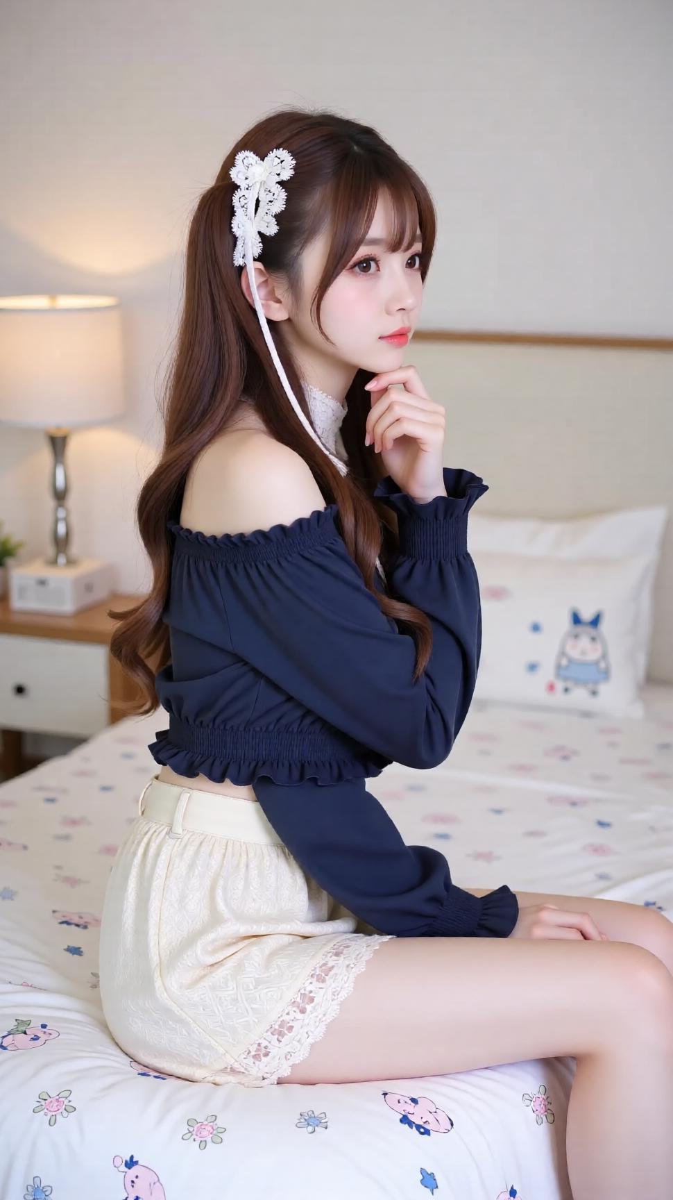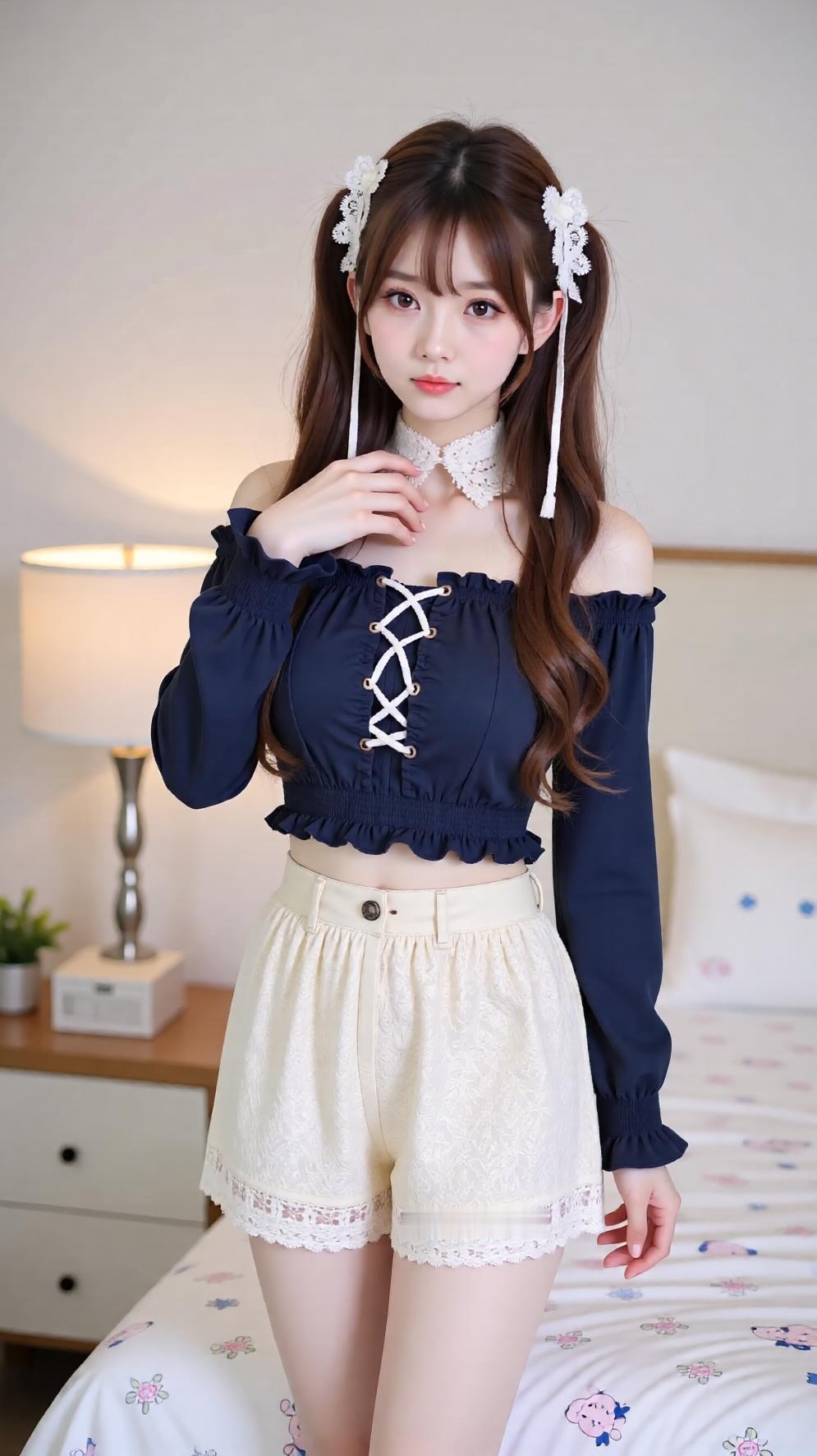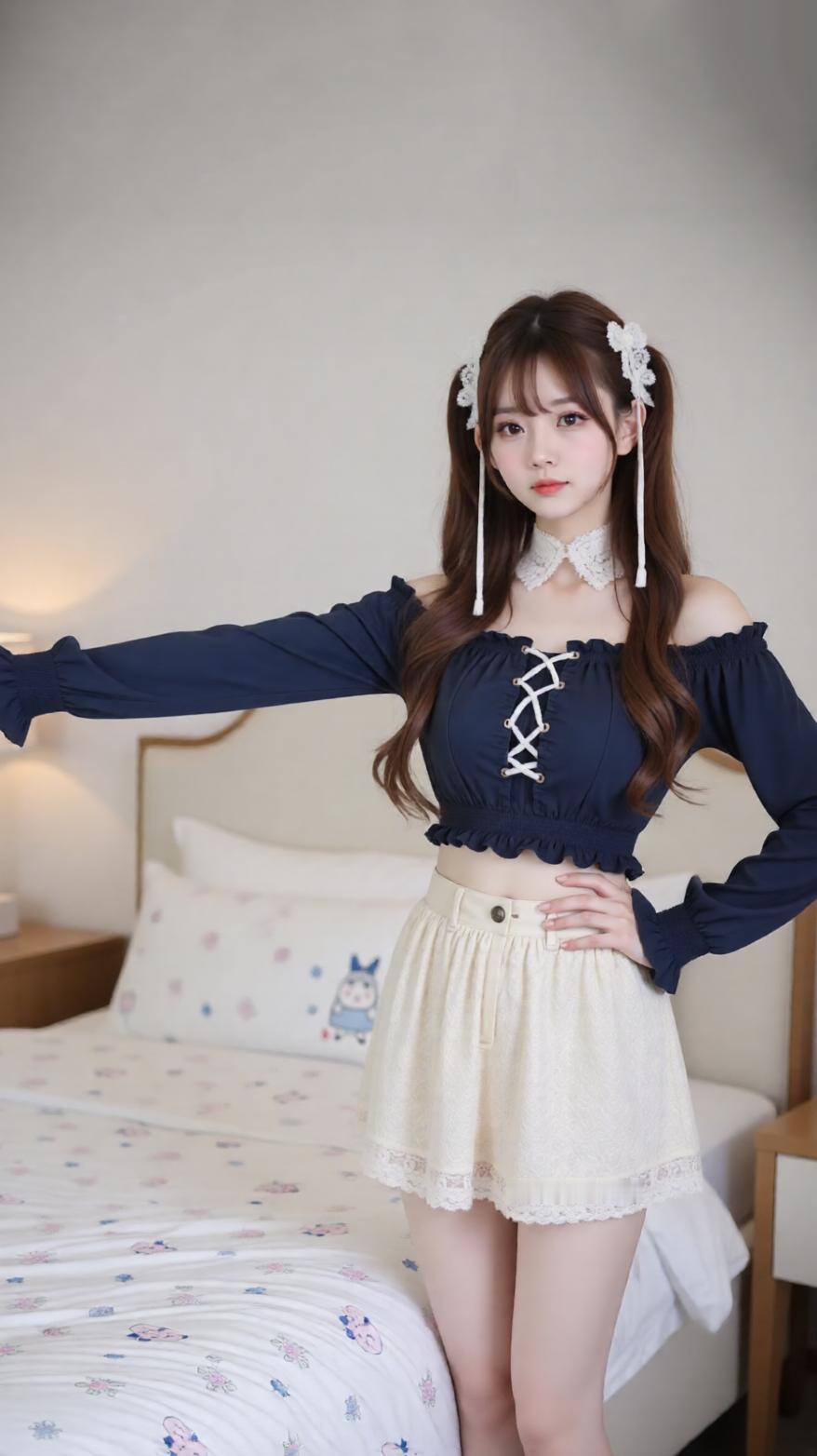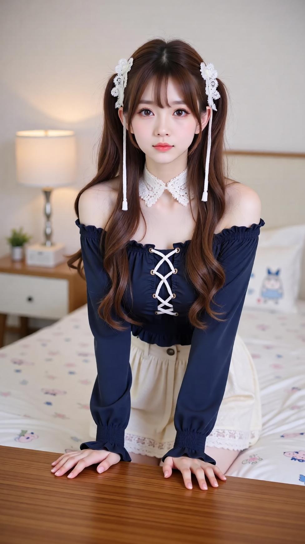 甜美少女风穿搭,可爱蝴蝶结发饰,清新卧室背景。