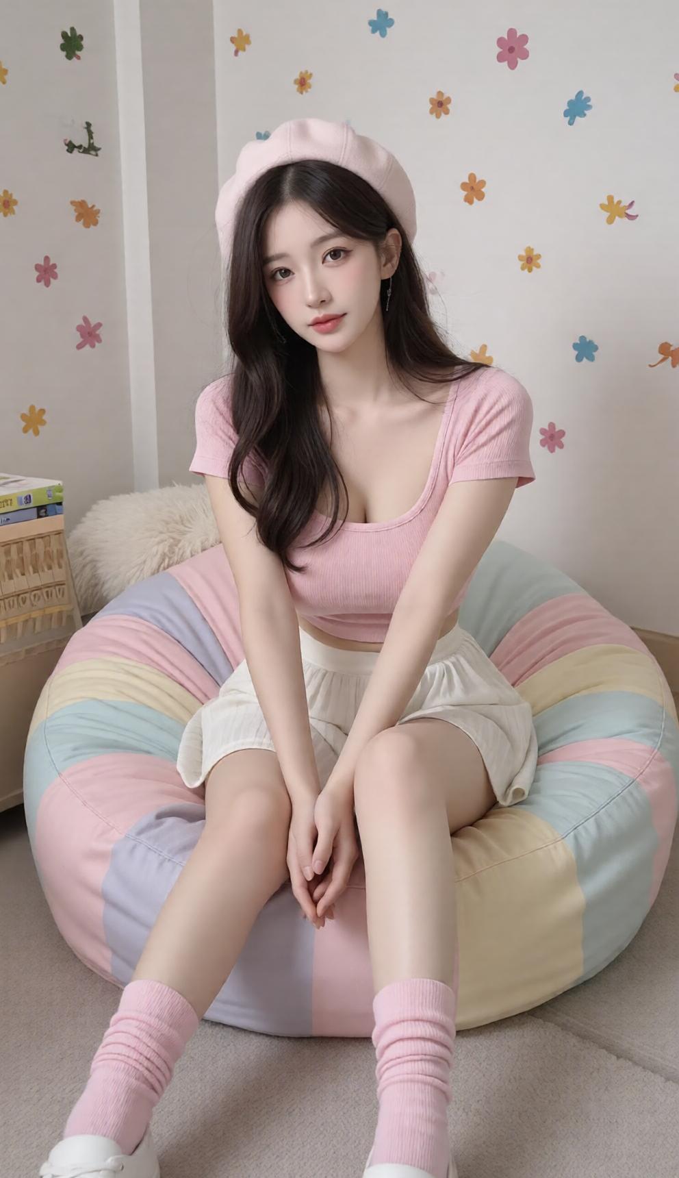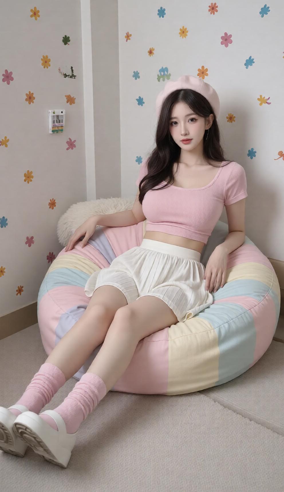 少女心满满,粉色穿搭与彩色豆袋椅的完美搭配,甜美又舒适!