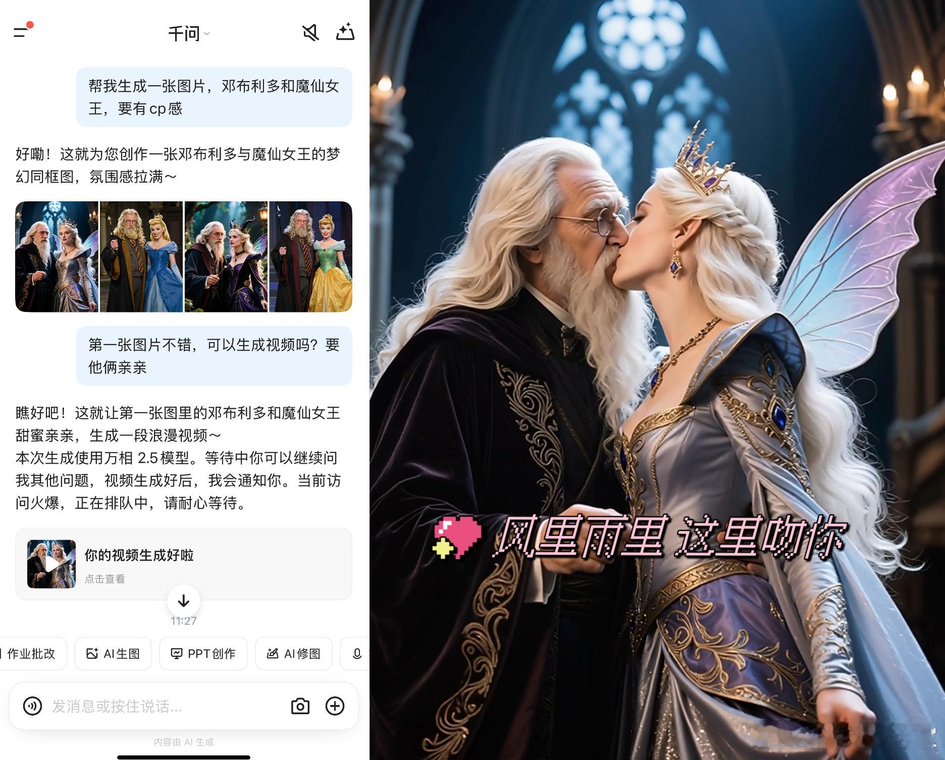 千问APP这“造梗”能力属实逆天了!🤣 AI什么邪门CP都嗑得下满血版生图模型一上线,全网秒变“嗑学家”——邓布利多和魔仙女王突然贴贴,黛玉和孙悟空也能组CP……专治各种CP脑洞,一键直出,连视频都能同步安排!🎬无论是跨次元组合,还是给自己和偶像“合影”,千问的AI生视频生图能力全都能接住。这下真的活成女娲了,想嗑什么自己捏~ 你也来试试你的“邪门”脑洞?👇