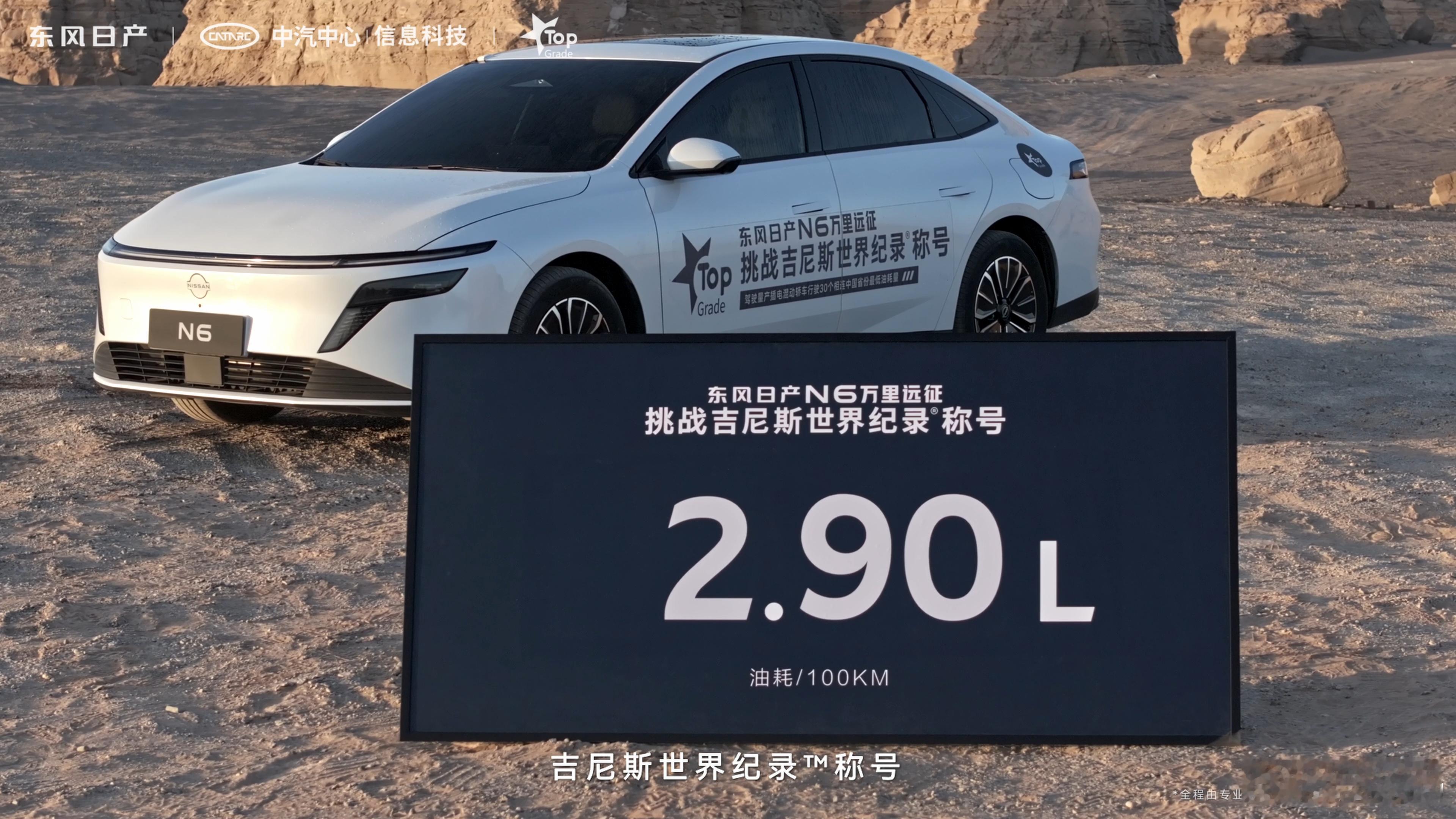 东风日产N6 东风日产N6联合中汽中心干了一个吉尼斯世界纪录认证。从新疆出发,花了28天,行驶了30个相连的中国省份,总里程14000+公里,只加了9次油,百公里油耗仅2.9L,直接打破了吉尼斯世界纪录。万里远征插混第一车这插混新势力,有点不讲武德啊!上来就给“老大哥们”上强度了。 大电池超舒适插混N6售9.19万起