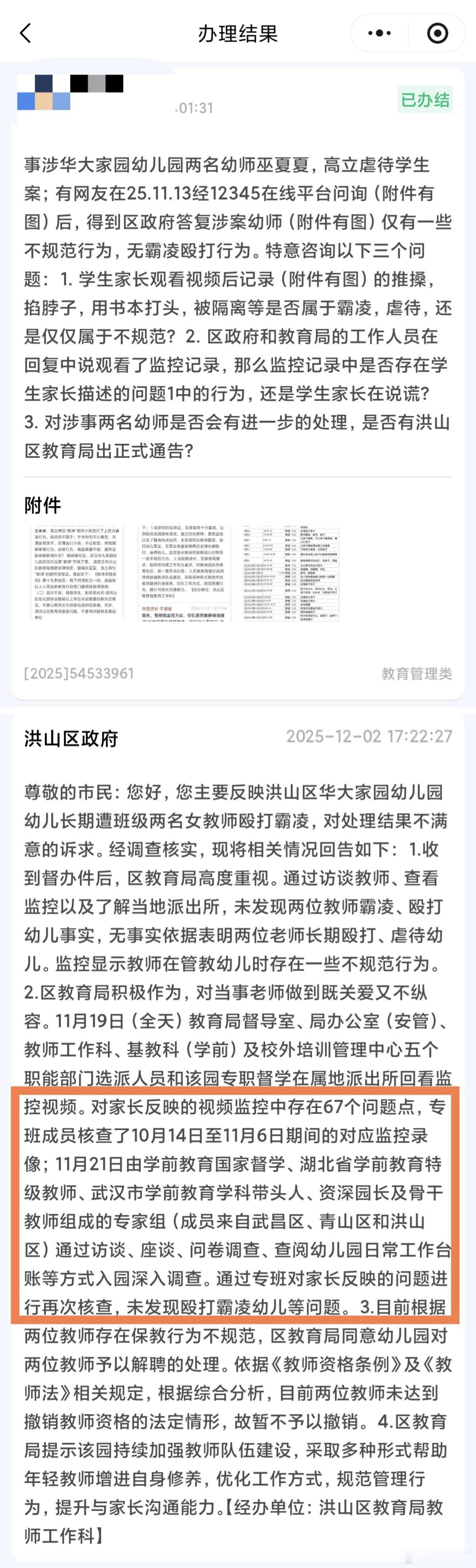 Li然于心称幼子被两幼师霸凌事件,又有新进展了。日前,有网友就相关事件咨询洪山区教育局,得到答复称:「涉事两幼师仅在管理幼儿时存在不规范行为,未有霸凌、殴打等」。