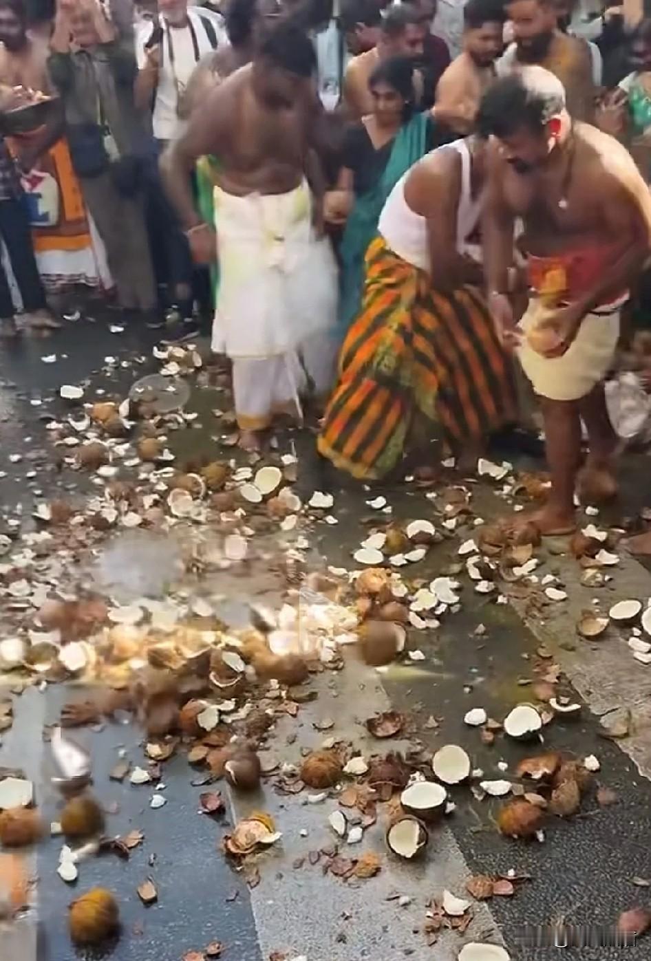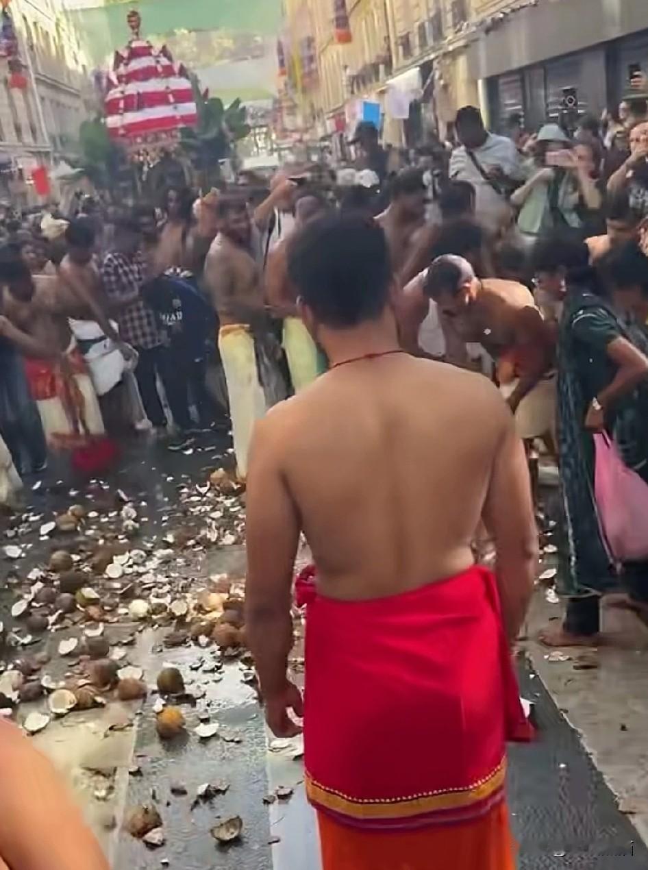 看到这些印度人在法国巴黎过象神节的场景,场面是极度的热闹,但是大家就只看到热闹了。 在巴黎繁华的街头,近几百名的印度人正过着自己的传统节日,他们赤裸上身和双脚,通过向地面不断投掷椰子,被砸开作为对象头神伽内什的献祭,象征着生活中的烦恼完全去除,会给自己和家人带来好运。 看着寓意倒挺好,但是为此造成的垃圾污染,以及对当地的居民产生的生活影响也是不容忽视的,给自己带来了好运,但是对他人来说可能就是灾难。
