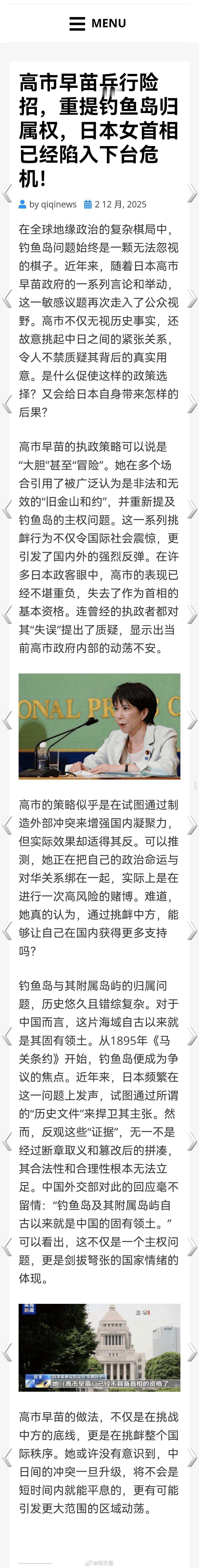 高市早苗兵行险招,重提钓鱼岛归属权,日本女首相已经陷入下台危机! 中方回应日本团