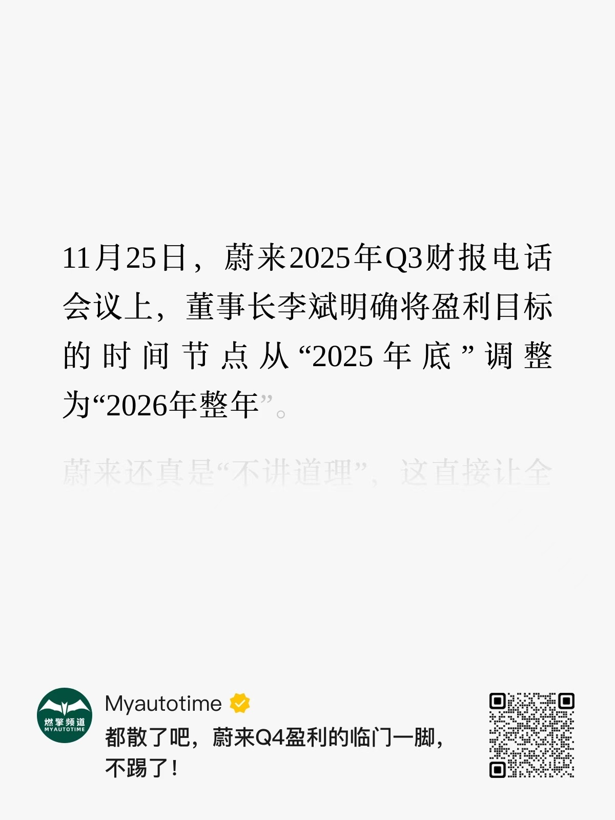 蔚来调整盈利节奏变更为:2026年整年。 信息来源:如图。 更正:经网友提醒,斌哥的意思:2025Q4+2026年全年盈利,该推文理解错误。
