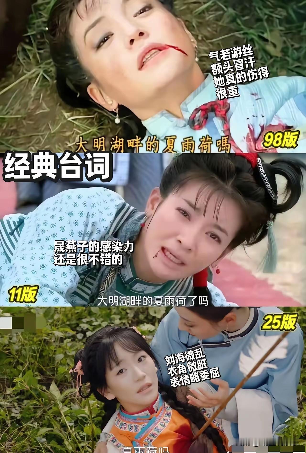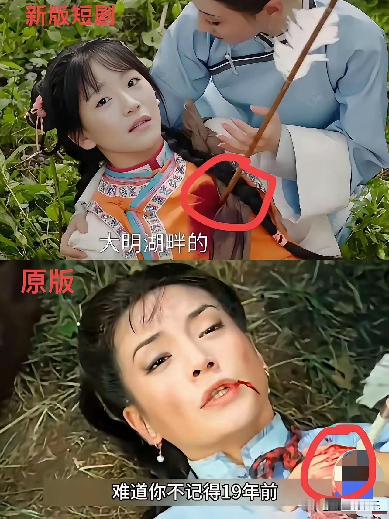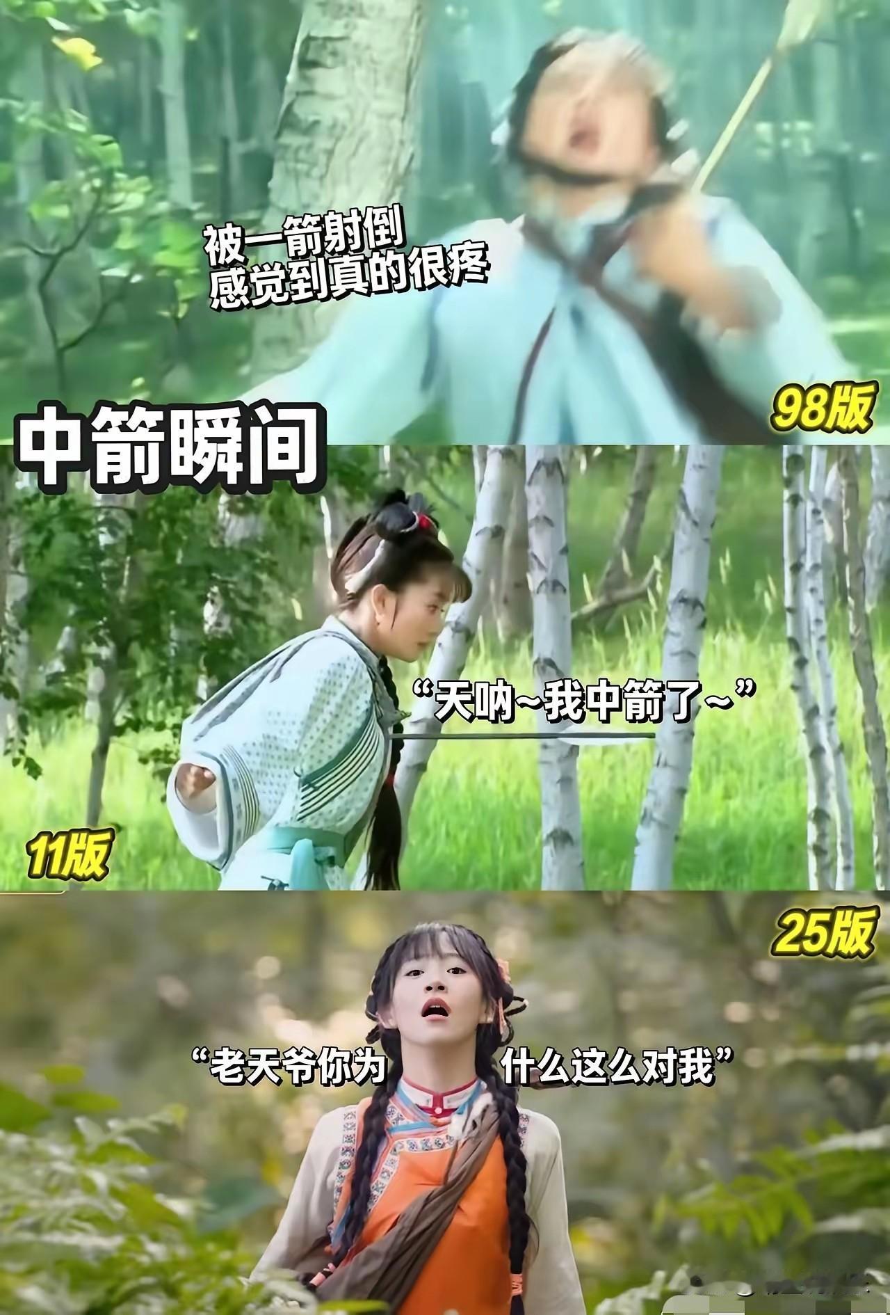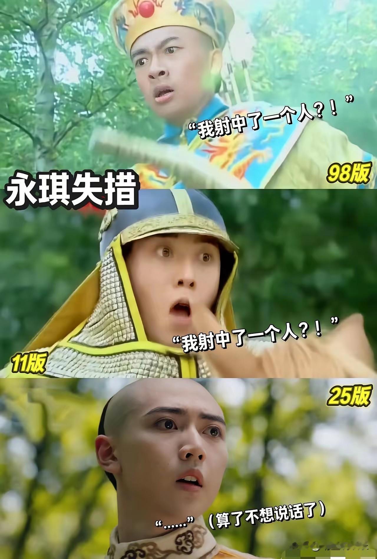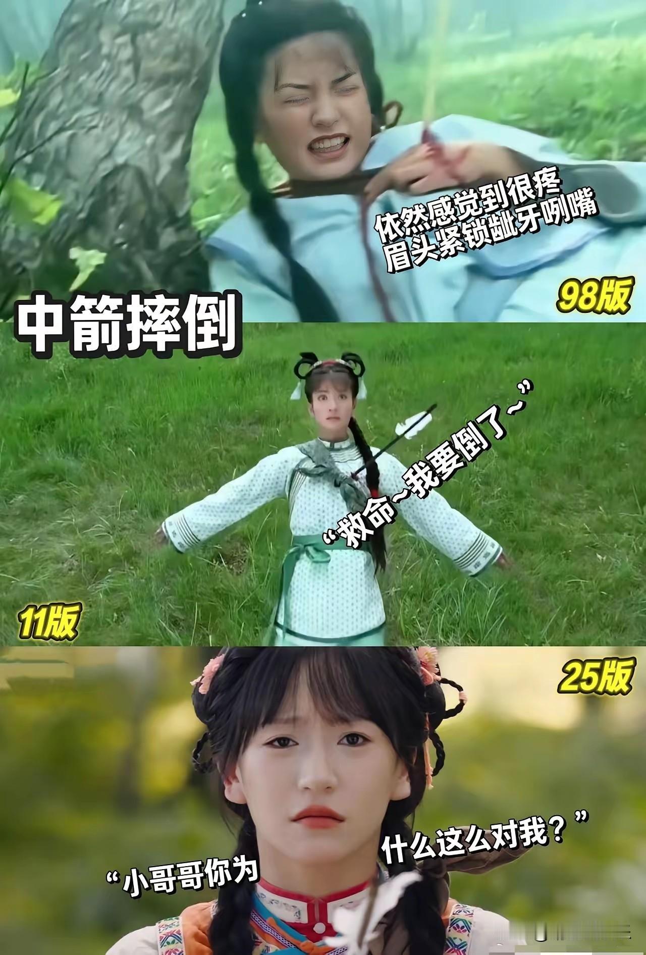 事实证明,不是所有的五阿哥射箭和小燕子中箭都是一模一样的。 苏有朋版的演技自然,扣人心弦,让观众跟着一起紧张起来; 李晟版的小燕子中箭像在玩游戏,一个字“尬”,虽然倒地后的演技不错,但已经挽回不了之前的突兀感了; 最新版如果不是事先知道他是五阿哥,我真以为是哪个大反派来了,射箭时的表情那叫一个“狠辣”。三角眼瘪嘴的小燕子更是让人“辣眼睛”,中箭时的表情像是情侣吵架时在生气发脾气。 OMG,能不能不要再随便翻拍经典大剧了?就把那份美好留在大家的回忆里不好吗?