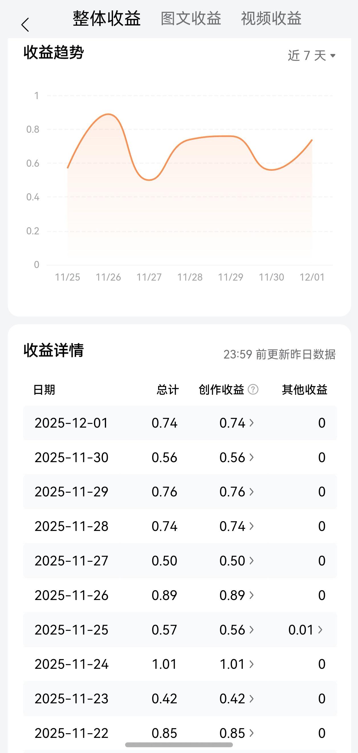每天收益不到一块钱,我还挺高兴的,天天写得不亦乐乎。哪怕只有一分也比零好。