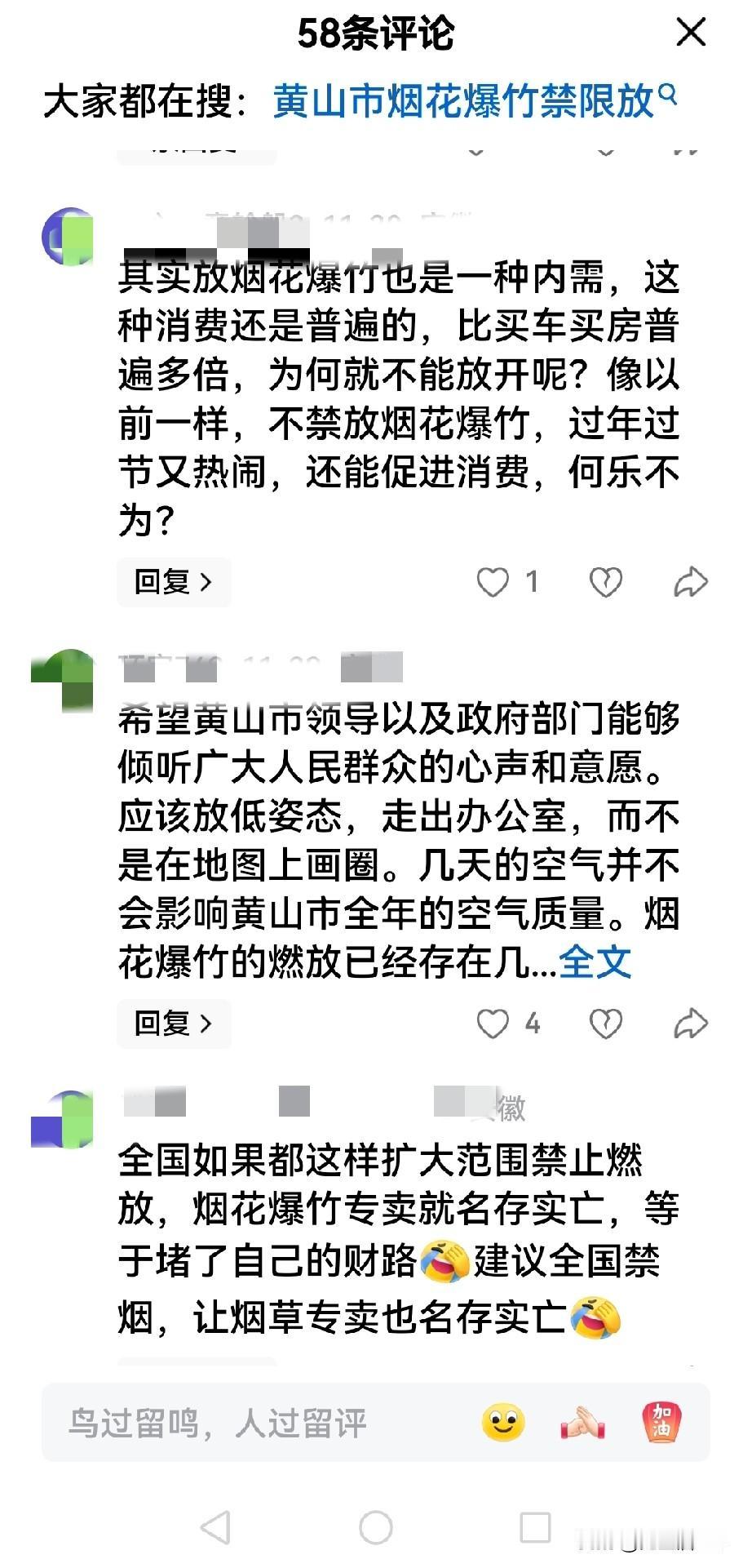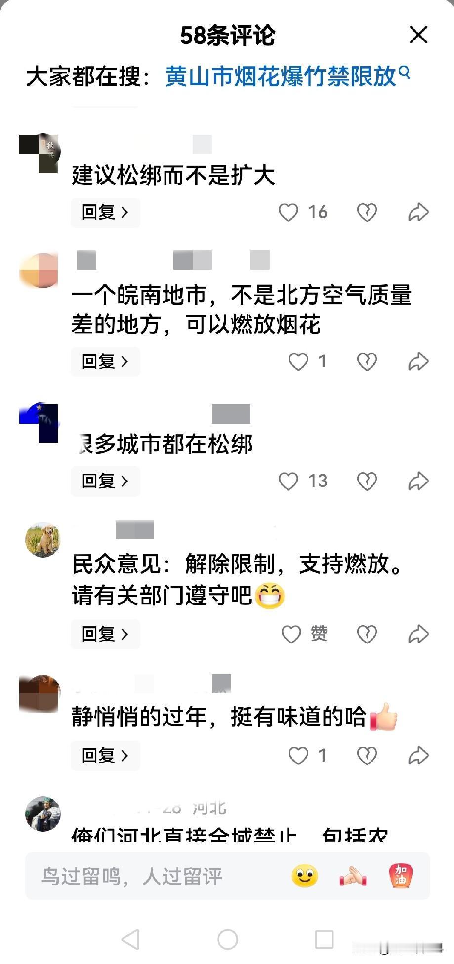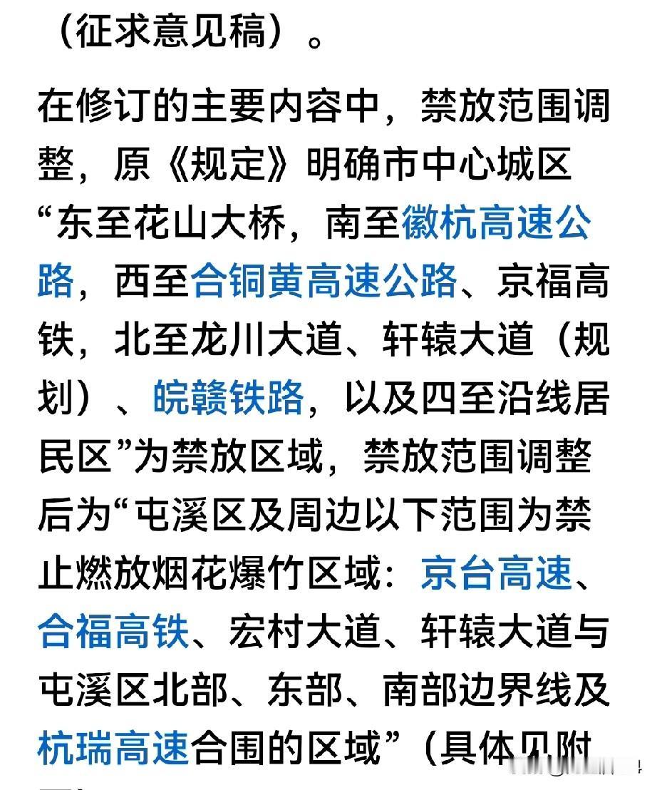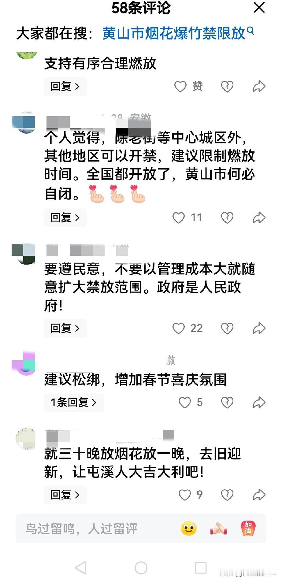 黄山市不能全面开放春节燃放烟花爆竹! 黄山市公安局会同黄山市生态环境局为了春节气氛和空气质量和环境,草拟了《黄山市燃放烟花爆竹管理规定(修订)》(征求意见稿),现公开向社会征求意见。征集时间自2025年11月24日-12月24日。 意见稿出台后,反对声音是一边倒,主要是认为,部分地区禁止燃放烟花爆竹,削弱了春节热闹的气氛(看一下截图),还有的认为破坏了传统文化。在这里我想说说个人看法。 住在屯溪市区的人不知道记不记得有一年,因为放开烟花爆竹,大年三十从三点开始,烟花爆竹声就开始不绝入耳,到到正月初一零点,达到最高峰,打断了老年人的休息,这是其一。那年大年初一,打开门,全部是雾霾,三米之外看不见人,要面对面才能确认是谁。因为看不清,公路上随处可见车祸,有的甚至看不清道路,开到路边沟里的都有,因烟花爆竹造成的雾霾导致太多的交通事故。有人说,都放了几千年了,为什么现在禁止了,因为以前放的都是普通爆竹,但是现在条件好了,放的烟花飞的更高,里面造成各种颜色的锂钠钾铷铯,加上粉尘,纸屑更多,所以造成的后果很严重。第三,市区全面放开,消防队都是随时待发,因市区一不小心,燃放后,仍燃烧的残留纸屑会飞在不引人注目的地方,造成火灾隐患。 这几年,因禁止部分地区燃放烟花爆竹,所以在市区道路还是很清晰,但是到了放开燃放地区,雾气马上立竿见影,这是没有风的情况下,有风,也会造成大面积的空气污染。 为了生活环境和安全,个人认为还是只能放开部分地区燃放烟花爆竹,其他地区关于烟花爆竹的燃放又是怎样规定的呢,值得大家讨论和商榷。 烟花禁限放 禁止烟花鞭炮 合法燃放鞭炮 禁止烟花违法