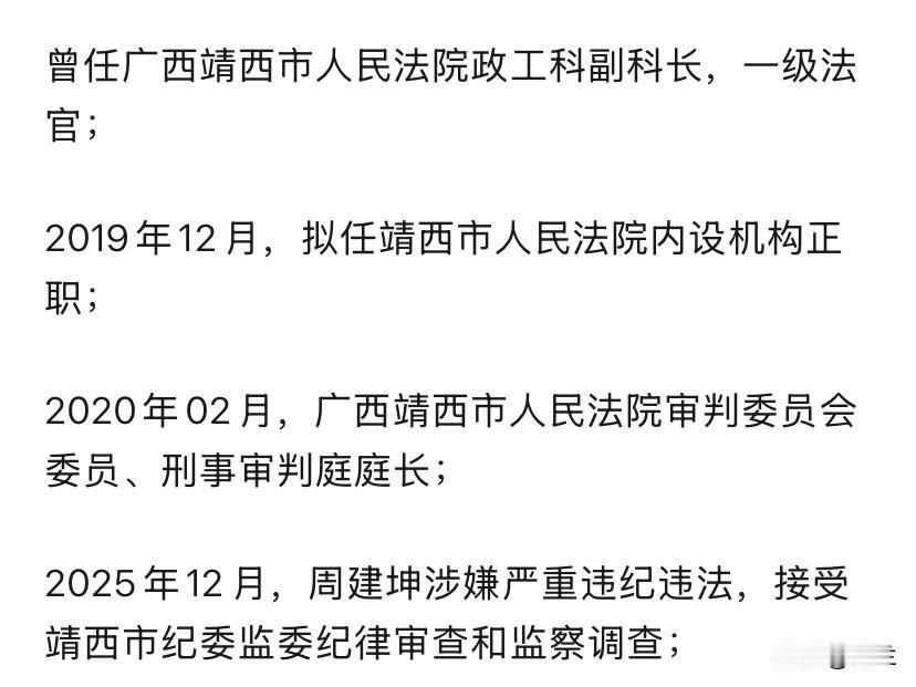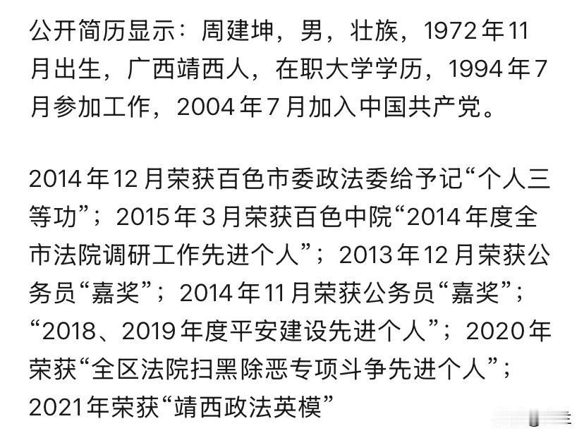 今天广西的周建坤上了热搜 他是1972年出生的广西靖西人 他长期在靖西法律行业深耕, 工作履历相当的丰富 曾在靖西任过不少关键岗位 也曾荣获多项重要荣誉 是靖西法律行业有名的资深人士 今年还在53岁的他 正是干事业的黄金年纪 没想到今天他却上了热搜 让不少熟悉他的人都感到惋惜 这也说明了 不管以前有多少荣誉 只要做了不该做的事 是不会被放过的!