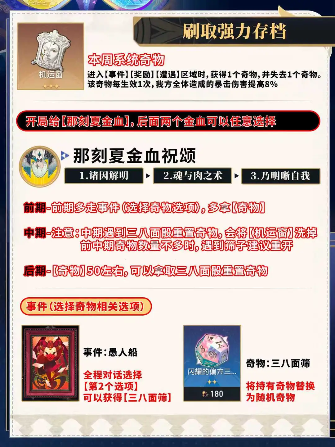 本周差分宇宙周期验算进事件为那刻夏祝颂和机运窗,很适合刷强力全祝福存档 强力存档在刷饰品的时候可以10秒左右一次,提高刷取效率 [向右R]也可以刷差分宇宙图鉴,在重置前拿完图鉴的星琼