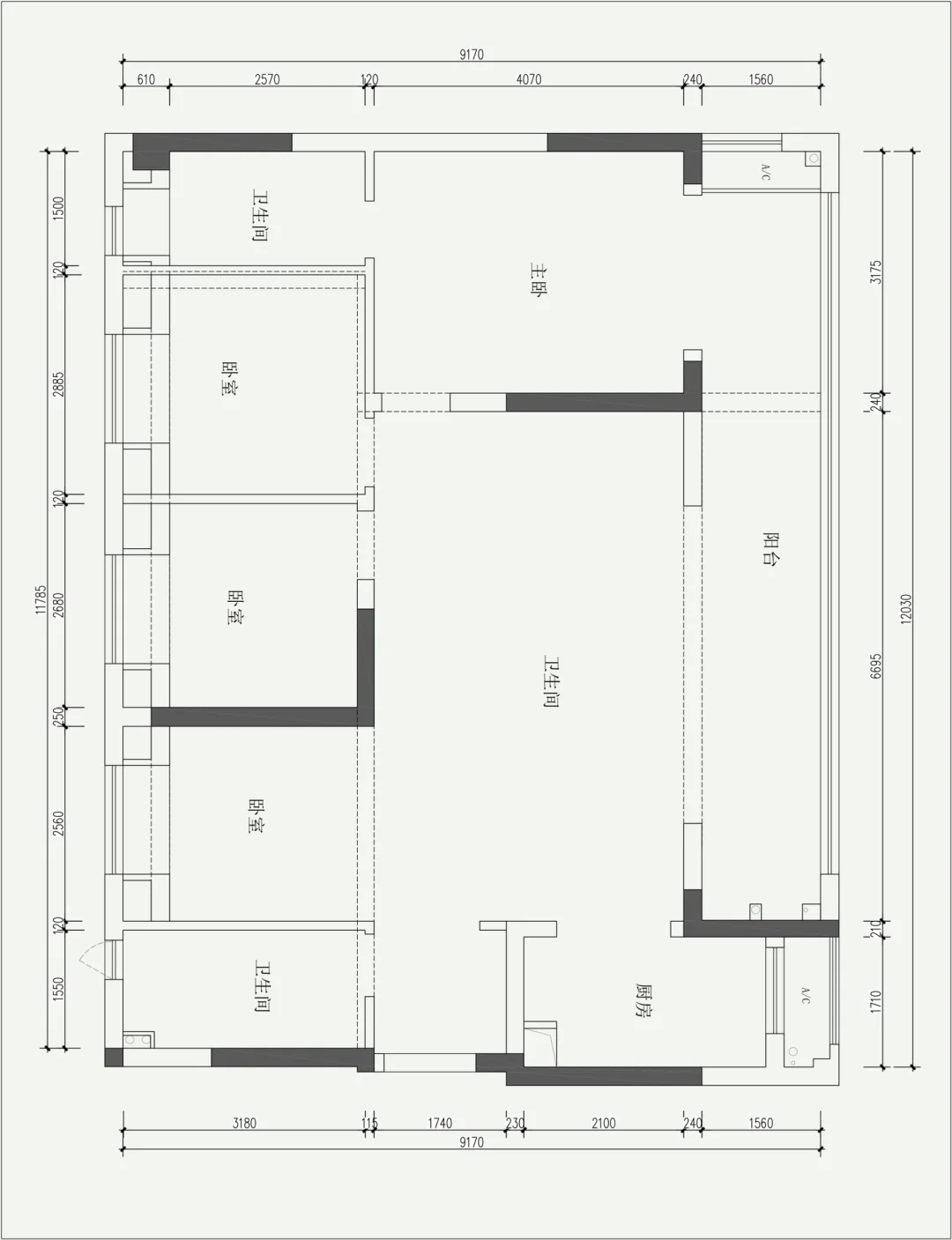 设计需求: 1、两人的浪漫之家(父母偶尔来住) 2、只需要两个卧室 主卧套间(主卫需要浴缸) 次卧做客房 3、柜子尽量多,储物空间多 4、突出大横厅的优势(阳台可封窗) 5、飘窗可拆