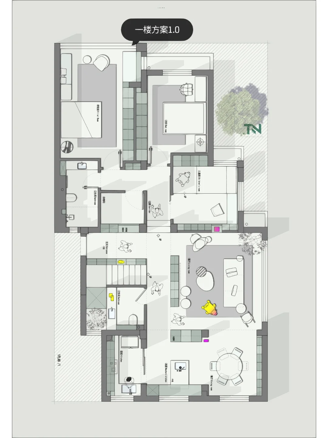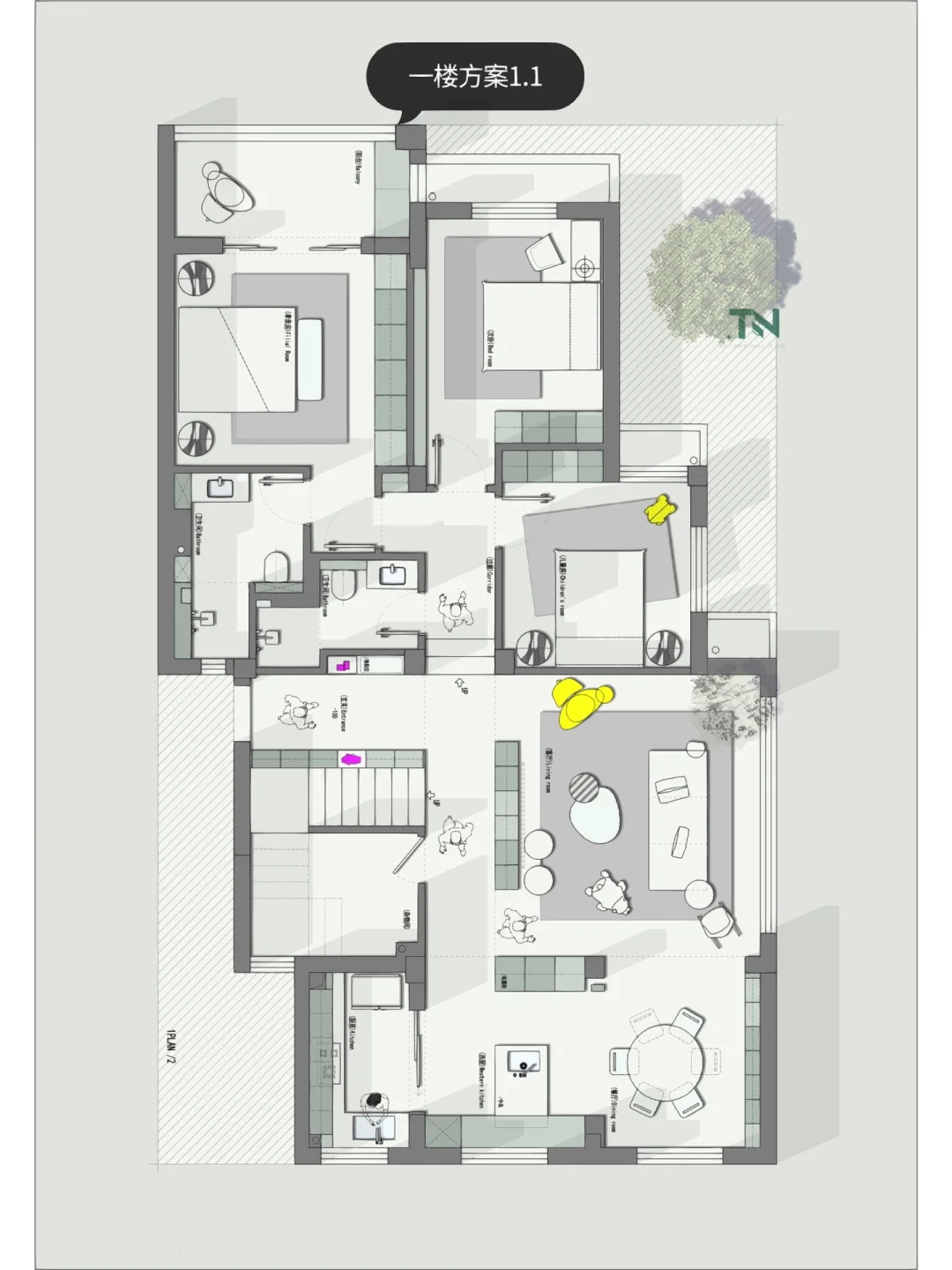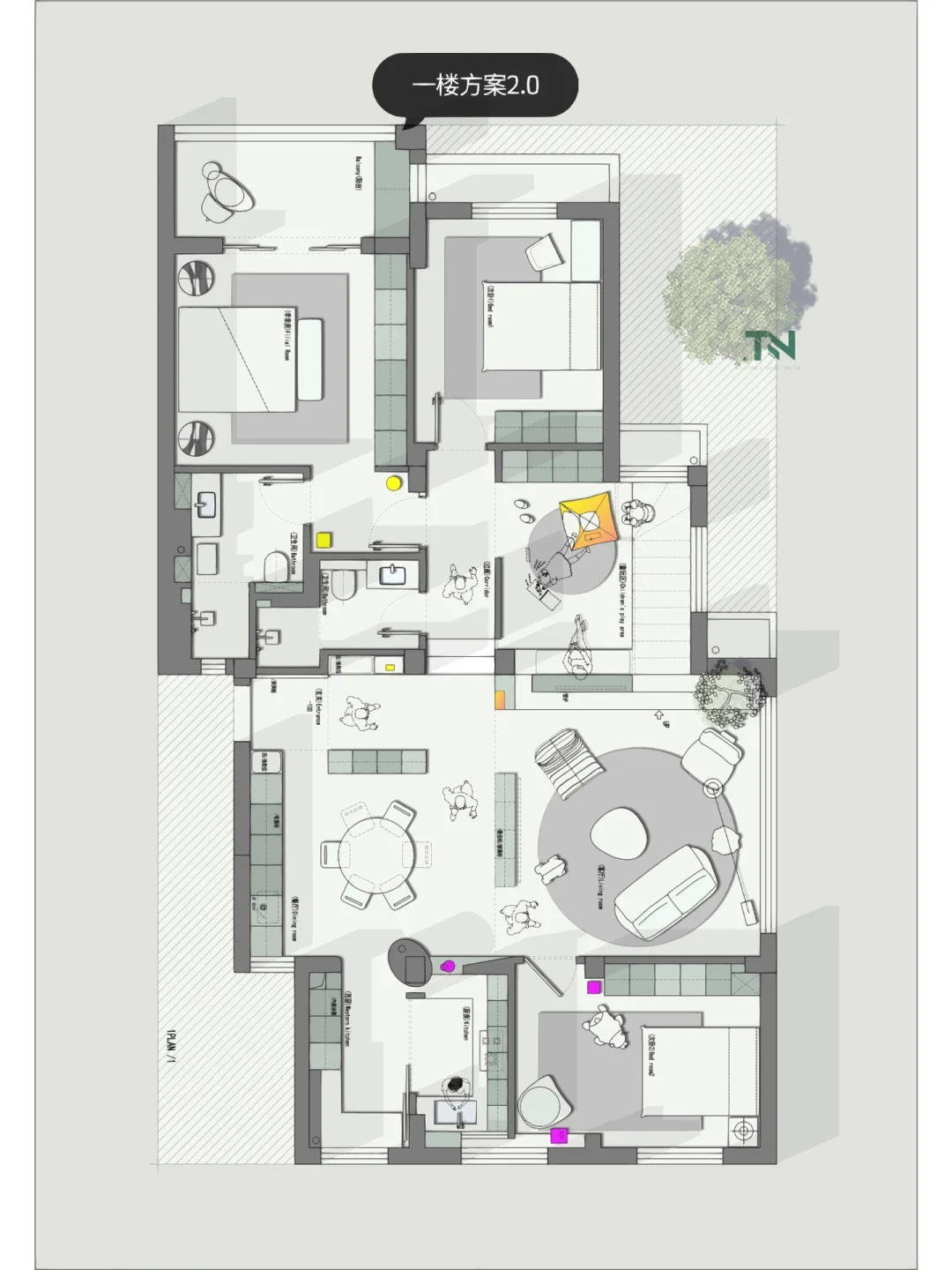 设计需求: 1、一楼需要三个卧室,长辈房、客房、小孩房 2、厨房需要中西厨 3、需要储物空间大的鞋柜 4、一个玩耍区 5、二楼,主卧套间,需要同时两人办公的书房、有健身瑜伽空间、休闲露台