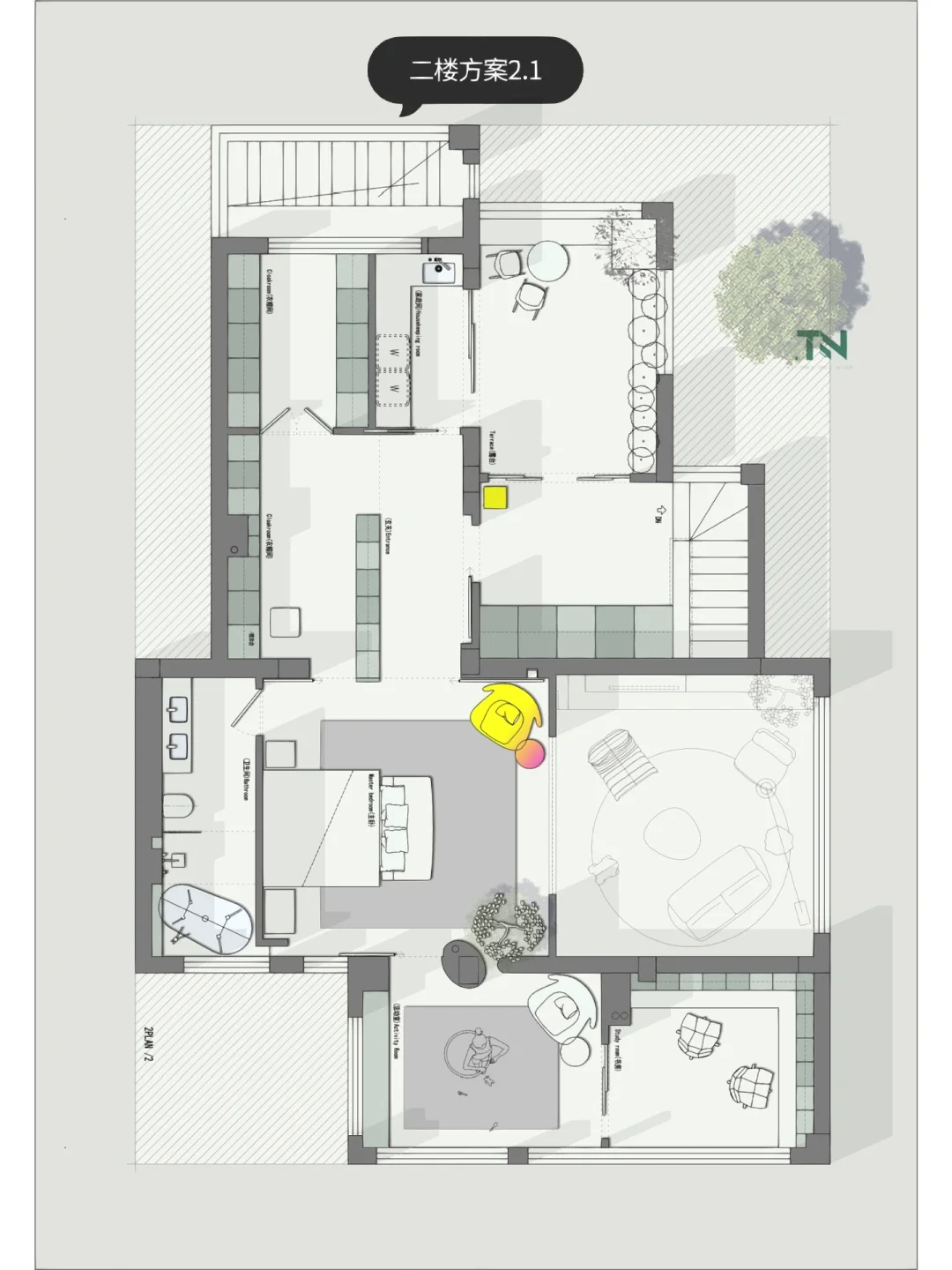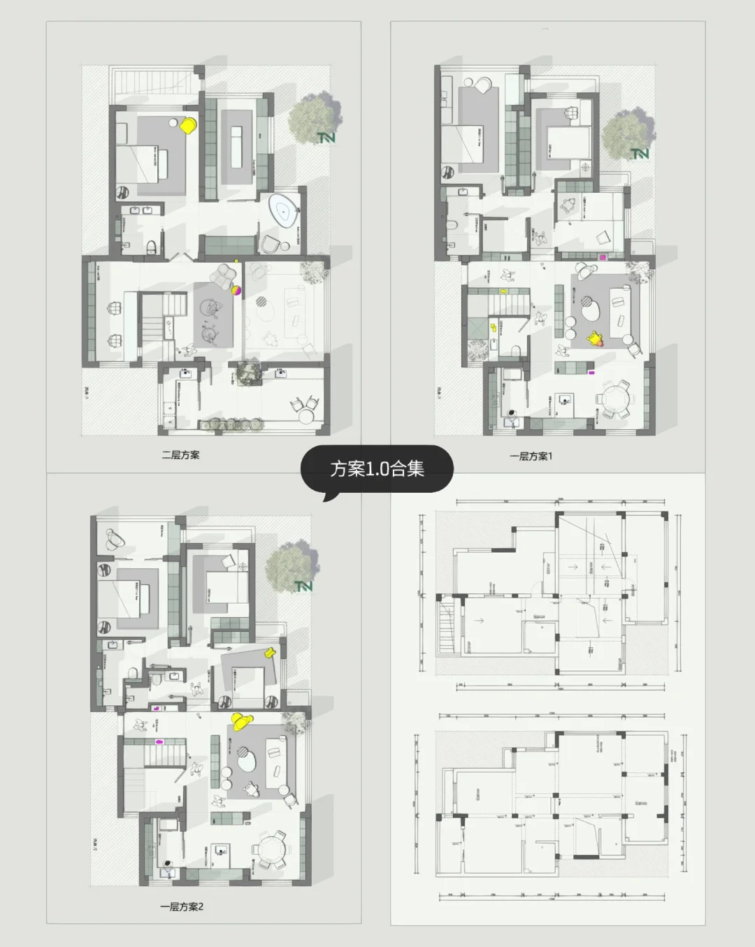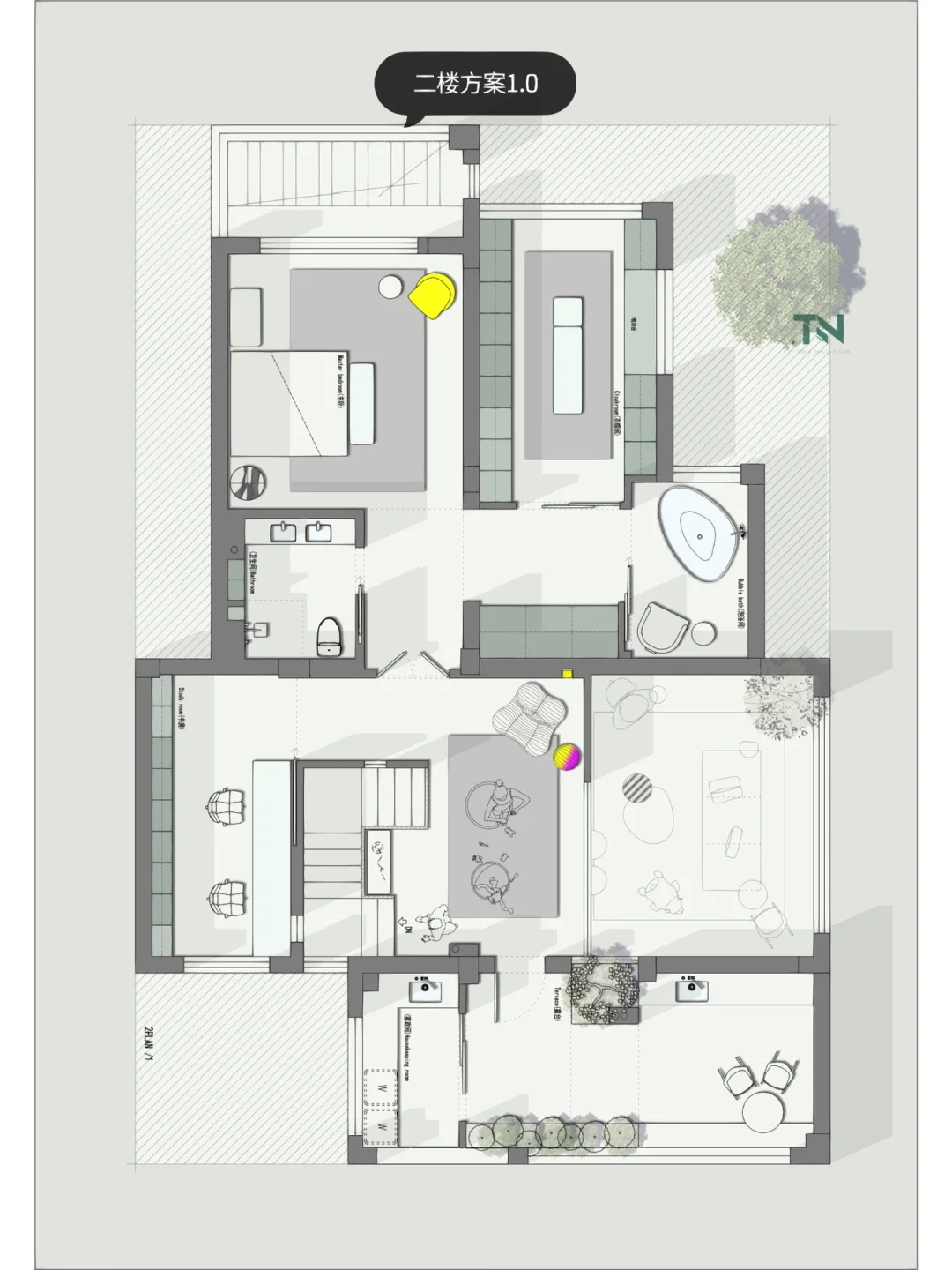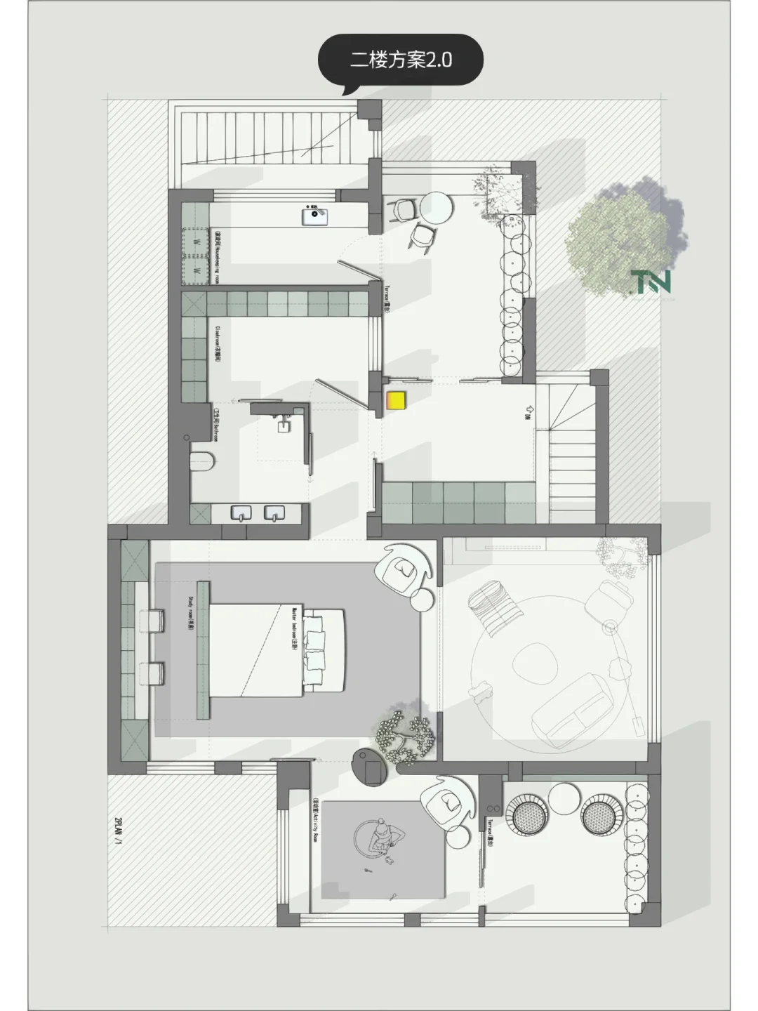 设计需求: 1、一楼需要三个卧室,长辈房、客房、小孩房 2、厨房需要中西厨 3、需要储物空间大的鞋柜 4、一个玩耍区 5、二楼,主卧套间,需要同时两人办公的书房、有健身瑜伽空间、休闲露台