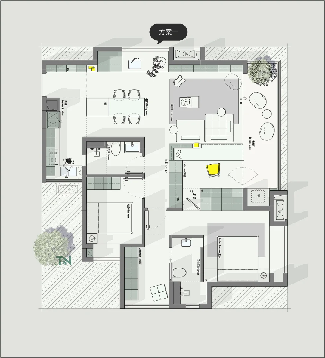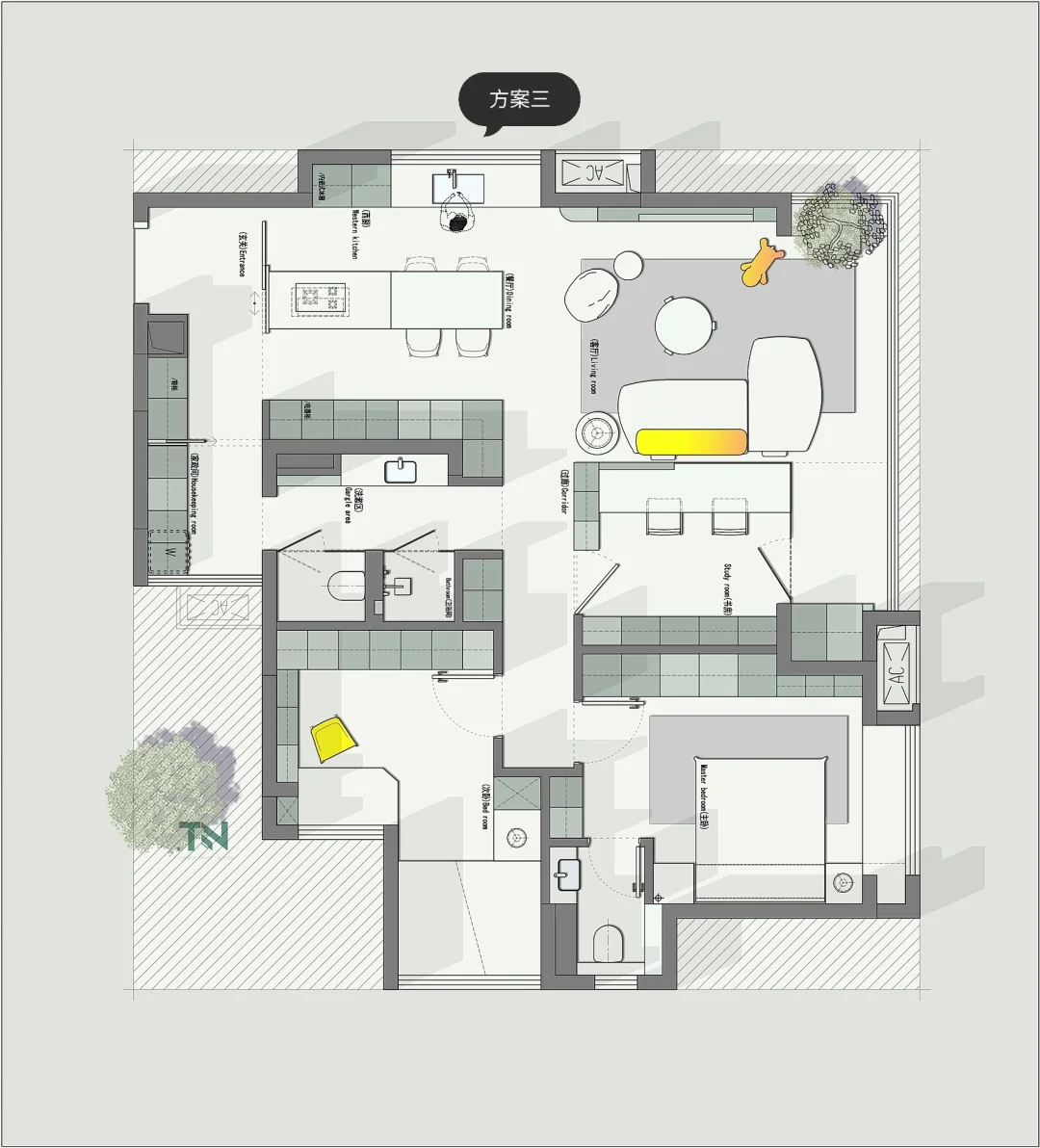 设计需求: 1、未来三口之家 2、三个卧室,想增加衣帽间功能 3、餐厨一体,接受开放式厨房 4、阳台可封窗,阳台预留晾晒区 5、想要大点的书房,可做客房