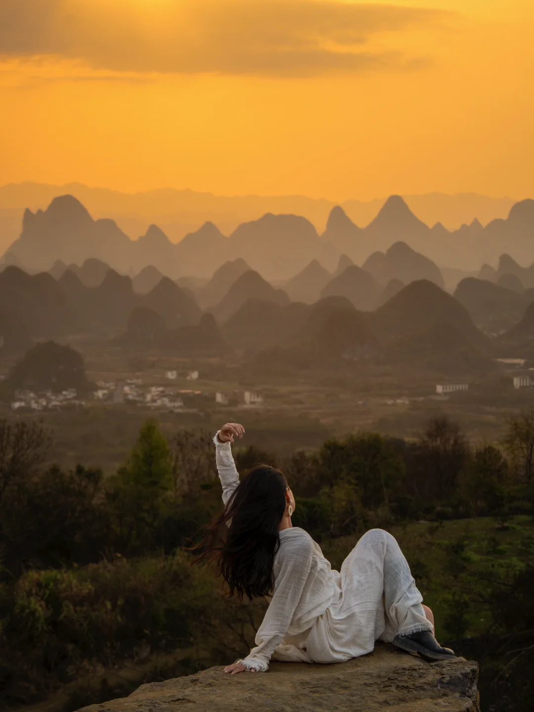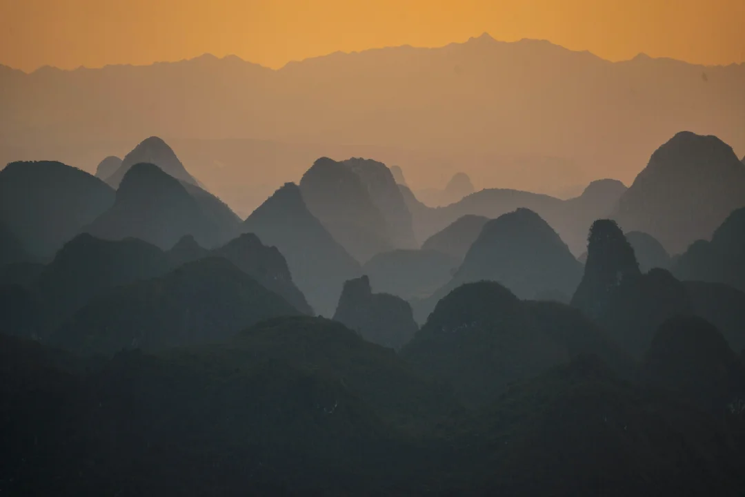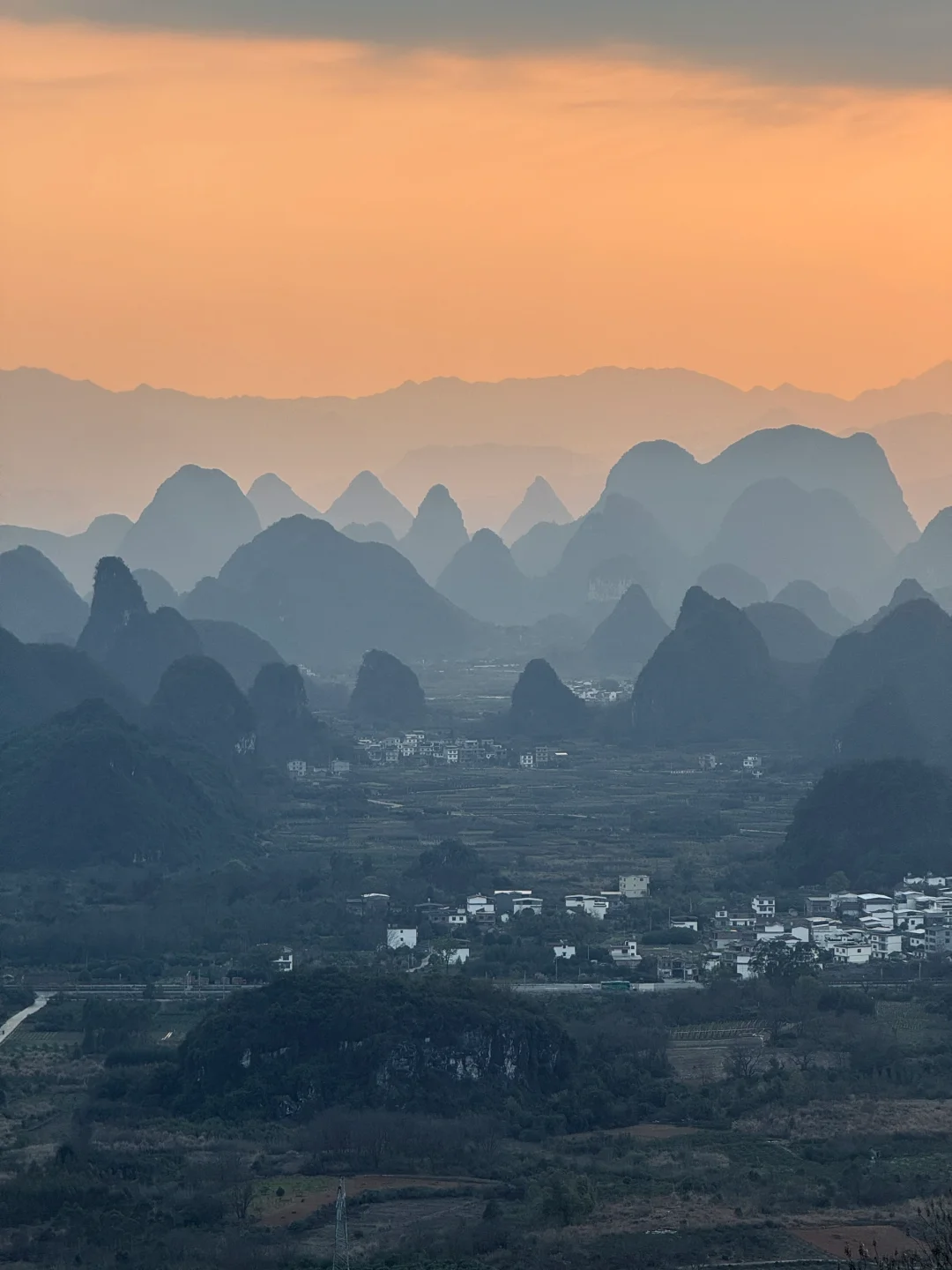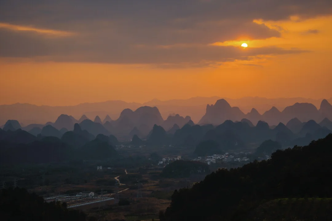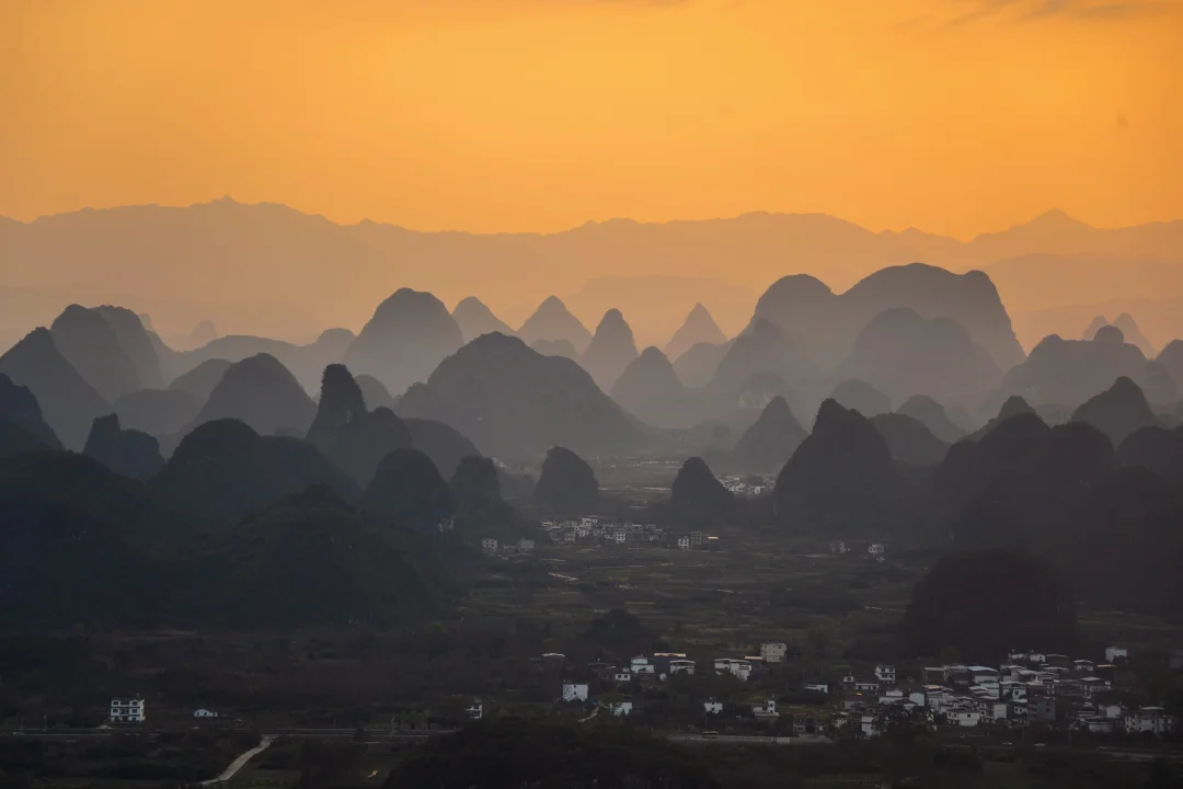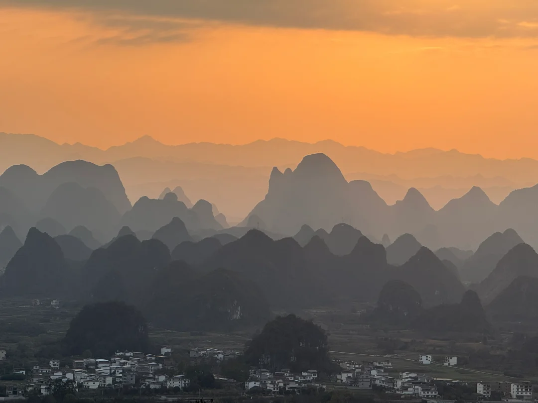 终于懂了宋画里的留白与诗意!阳朔的山水,像一幅天然的水墨画卷,而我在这里拍到了现实版的千里江山图,江山如画! ◾️打卡攻略 📍拍摄于广西,阳朔,千里江山图打卡地 可直接导航【千里江山图大型水墨画打卡地】距离阳朔约40分钟车程,快到山顶上需要提前停车,再走一截盘山路上去。 ⏰最佳时间: 提前看当天日落时间,日落前40分钟到达拍照等待 📷 记得带长焦,可以拍出山水错落有致层峦叠嶂的氛围 没有人能够拒绝这样的中式写意山水吧[皱眉R]