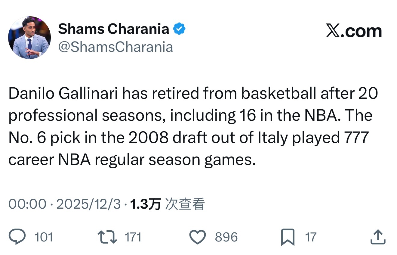 Shams:加里纳利在征战20个职业赛季(其中包括16个NBA赛季)后,正式从篮球界退役。这位2008年从意大利登陆NBA的选秀第6顺位球员,其职业生涯共出战了777场NBA常规赛。