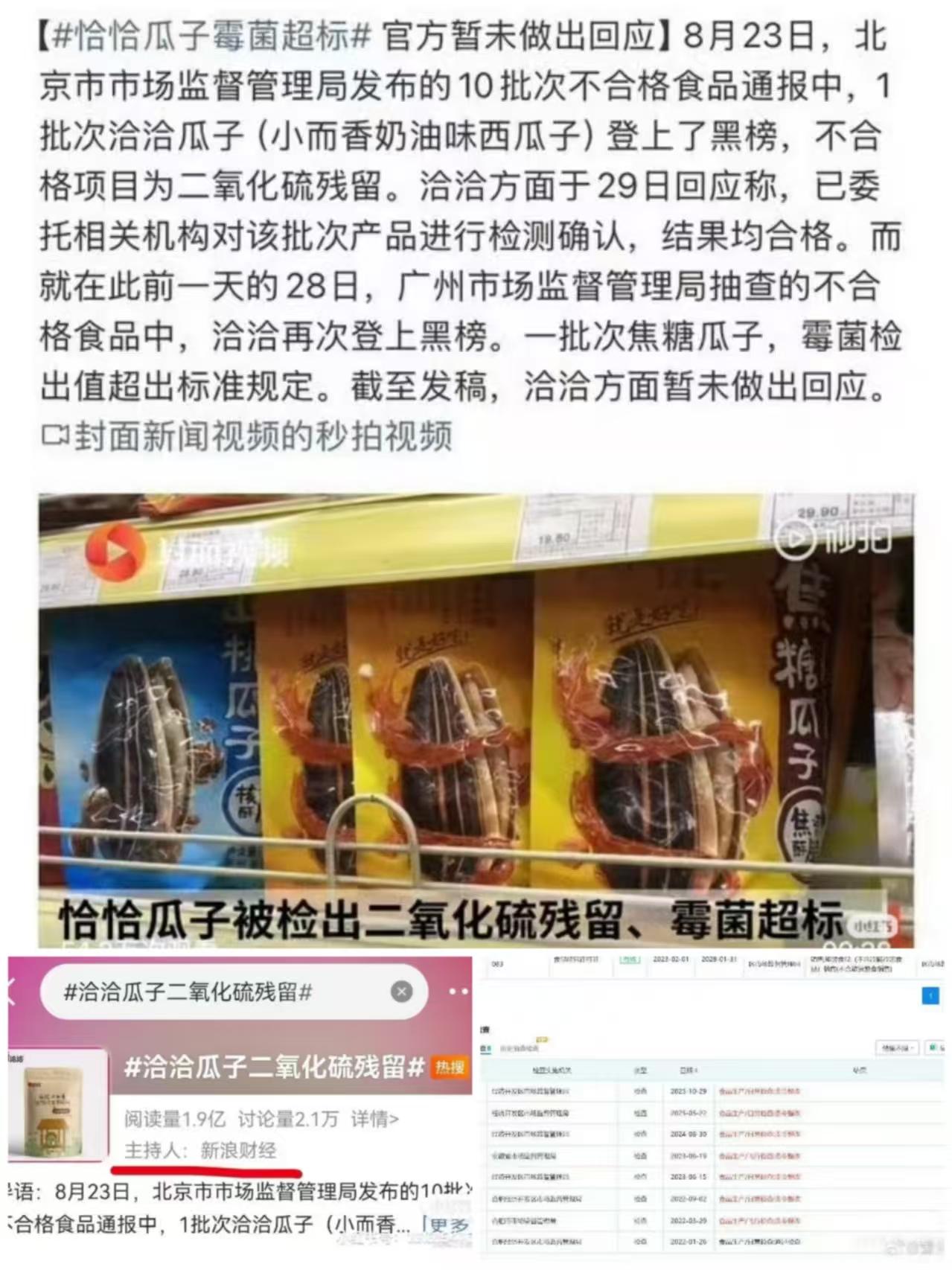 让恰恰瓜子最害怕的事情来了! 不是文案做得好, 也不是产品卖的品类多,而是一句玩黑梗,让自己的品控又再次曝光了! 恰恰瓜子检测出二氧化硫,霉菌超标!瓜子卖真的又贵,坏果又多!年年检测有问题! 有吃到虫眼的,有吃到苦味的,铅含量超标的,瓜子里面发霉! 明明是品牌方为了转移食品安全问题,匆匆入场粉圈战争,如果这样就成功转移视线,以后食品安全问题更没人处理了! 洽洽原味大瓜子 洽香瓜子 恰恰多味瓜子