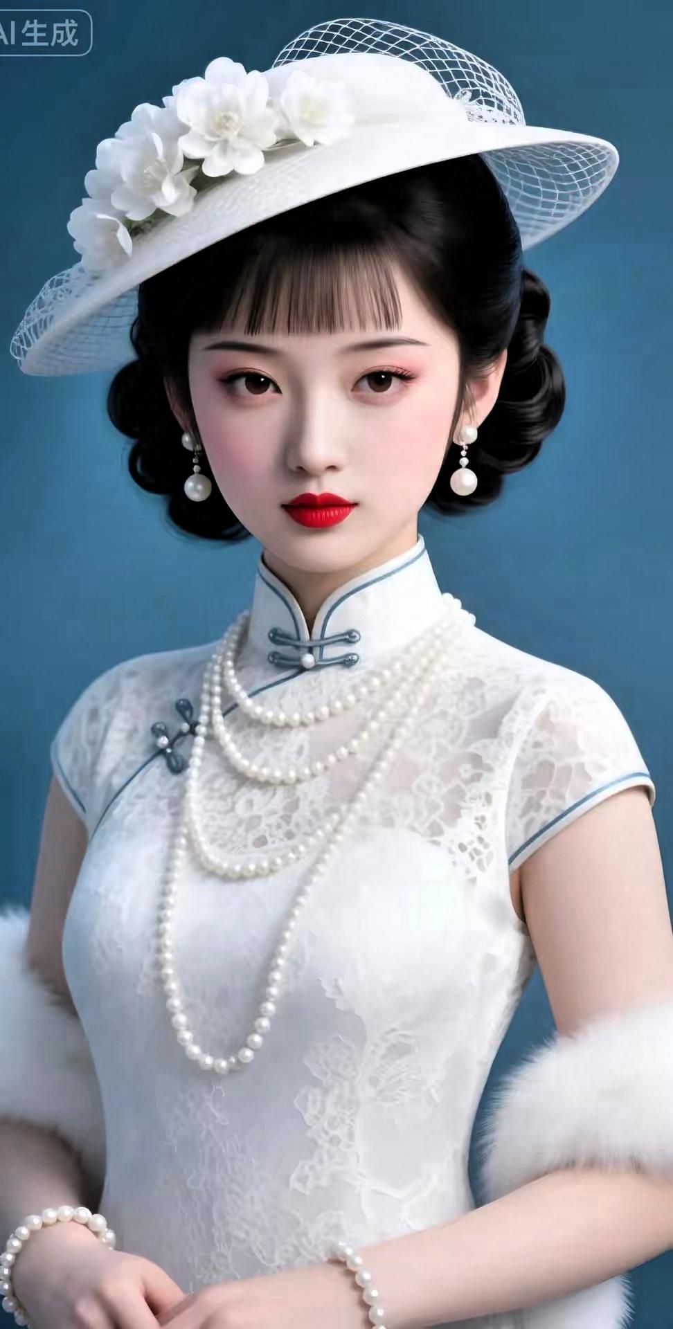 复古民国风,优雅白裙与珍珠配饰,尽显古典韵味。