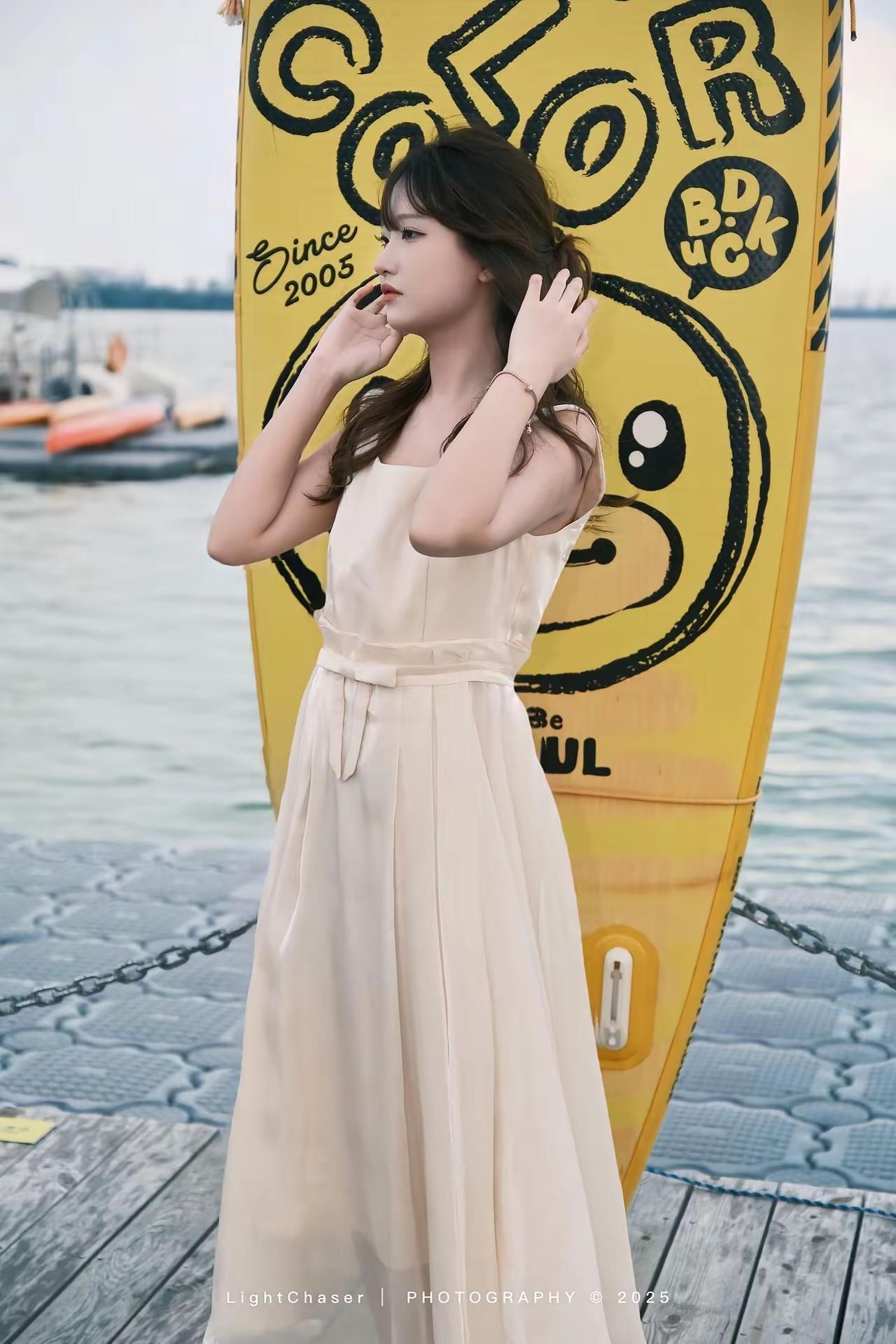 米白缎面衬着中式盘扣的柔,流苏腰饰坠着清雅的韵,园子里的光裹着笑涡,连国风都漫着