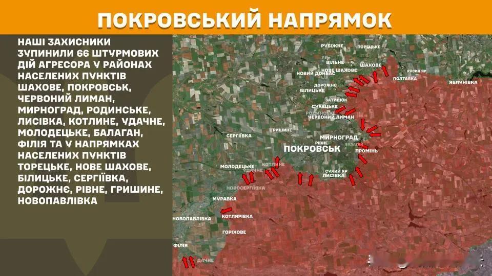 波克罗夫斯克地区 乌军挫败了俄军在新沙霍夫、多罗日涅、尼卡诺里夫卡、比利茨克、沙霍夫、罗季恩斯克、米尔诺赫拉德、新埃科诺米赫涅、里夫涅、波克罗夫斯克、兹维罗韦、科特利内、乌达赫涅、莫洛杰茨克、新皮多霍罗德涅、菲利亚等地发动的72次进攻行动。 此外,俄军向赫里希涅方向的进攻也被成功阻止。