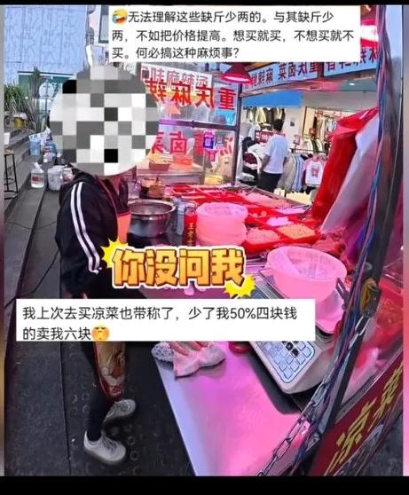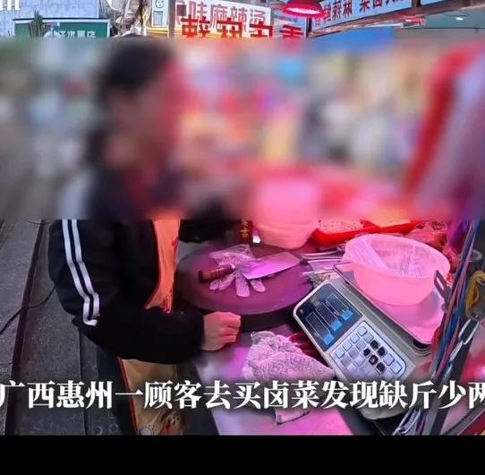 顾客买卤菜发现缺斤少两去理论,摊主理直气壮说,你又没问我, 别人都知道我家秤不准。 天呐,这是什么理论? 男子说我问你多少钱1斤, 你说22元, 我这24元的,够1斤吗? 摊主说不够呀, 我的称本来就不准, 你又没有问我, 外边买, 都是这样的, 大家都知道我的秤不准。 气得男子咬牙切齿, 这样缺斤少两,还理直气壮。最后,男子状告到管理部门,管理部门因为她是流动摊位,把她的称没收了, 把男子的卤菜退给了摊主。 网友说,真牛逼!管理部门应该也知道,最后只是没收了称!