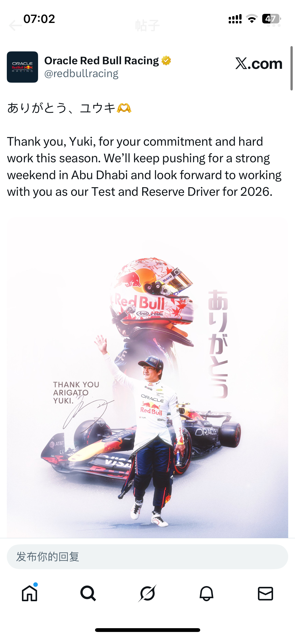 红牛官方对角田表达感谢👇🏻“感谢角田裕毅本赛季的付出与努力。我们将在阿布扎比