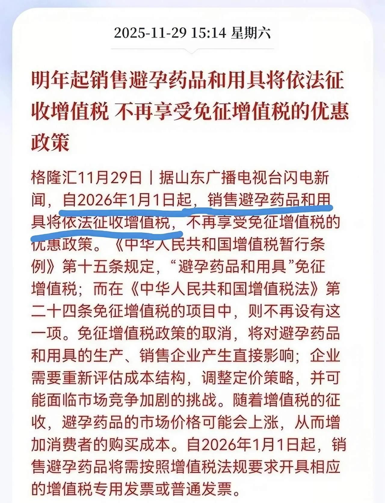 刚刚得到一个消息(算是好消息吧)! 也许对一些人来说是坏消息。 意思就是说从明年起,2026年1月1日起,避孕套(含避孕药及避孕药具)不再享受免征增值税的政策了。 还有的人在网上说自己现在单身要不要多屯点,不屯多点会吃亏的说法呢! 个人觉得还是一切遵守相关部门的规定。以上仅供参考,属个人意见,材料源自网络。