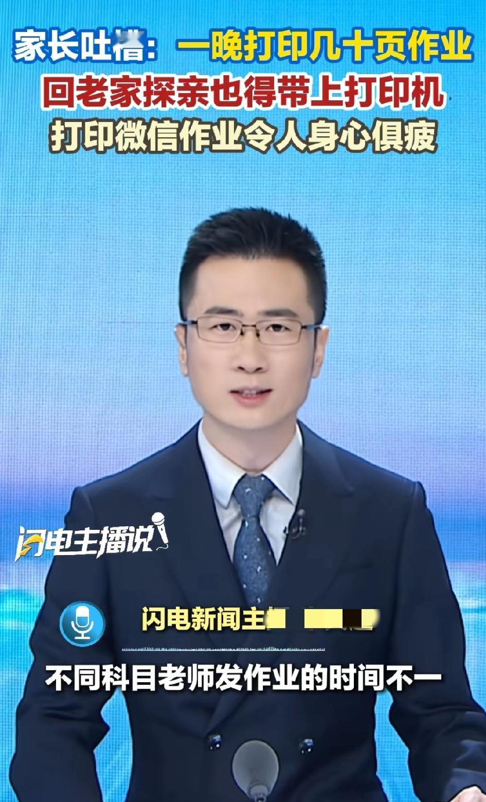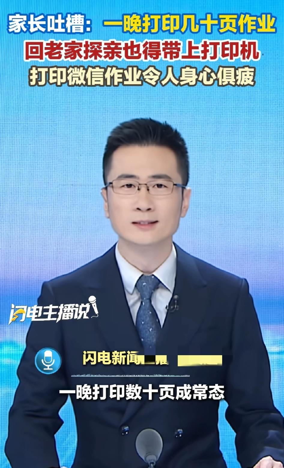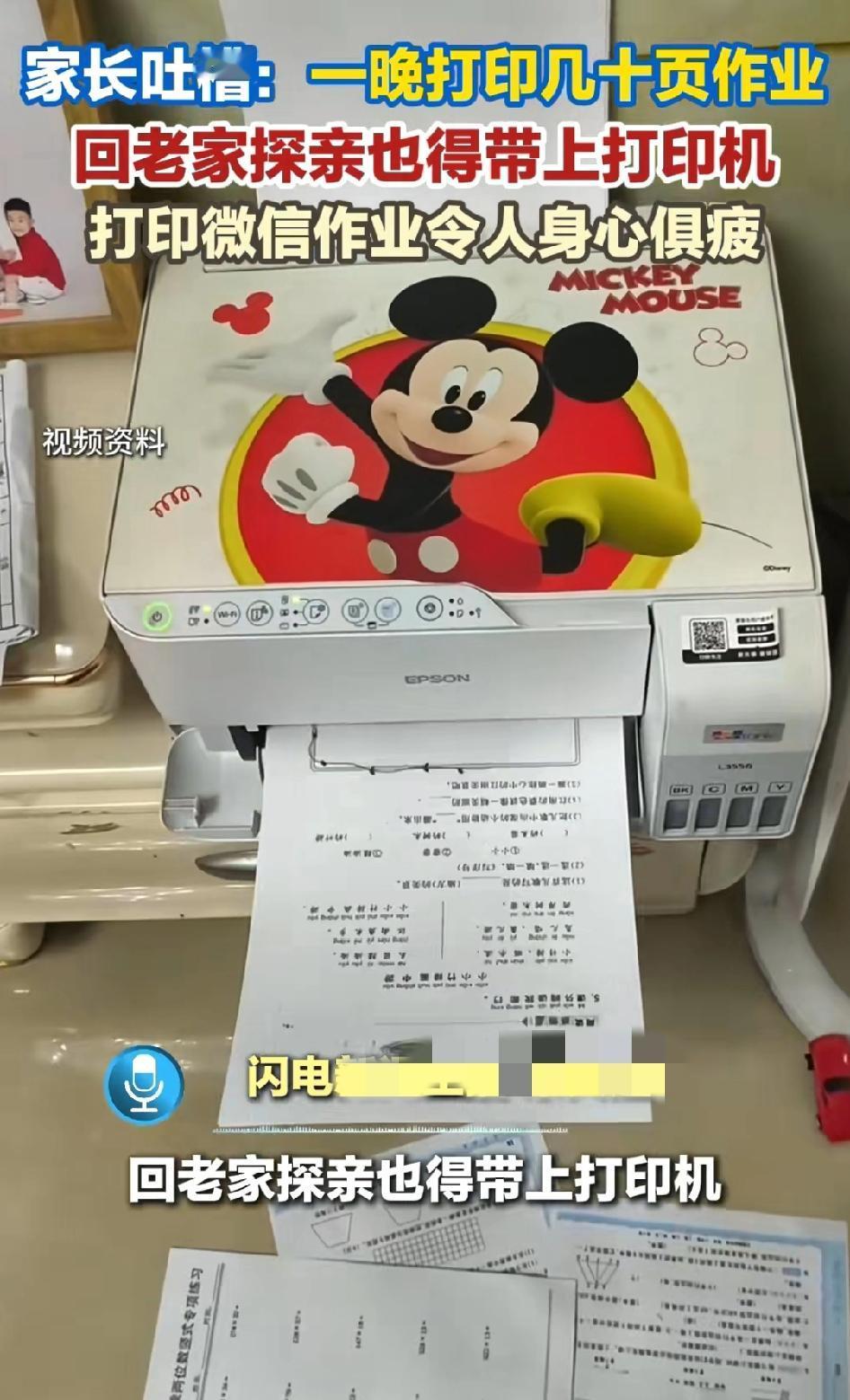 家长吐槽一晚上打印几十页作业,回老家探亲也要带上打印机。家长感到身心俱疲。 此事引起网友热议,有网友说:“到底是哪里需要人人一个打印机呀?反正我们这边从来没有打印过试卷。” 还有网友说:“以前都是题目写在黑板上,大家抄回去做的,既能多练字,还能把题目做了。” 也有网友说:“ 真的是身心俱疲,每天都要有打印的作业和卷子,真的特别想恢复一门一科练习册,直接发到孩子手里,需要写哪页,让孩子写就行了,不要再折腾家长了。” 对此你有什么看法? 冬日生活打卡季 (信息来源:闪电新闻)