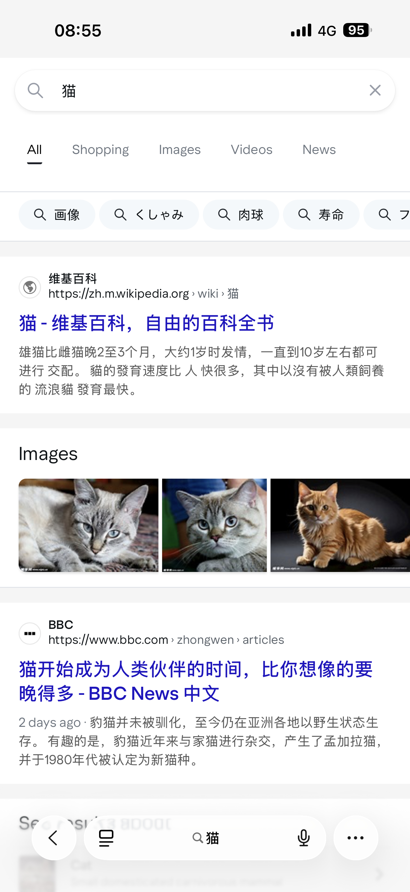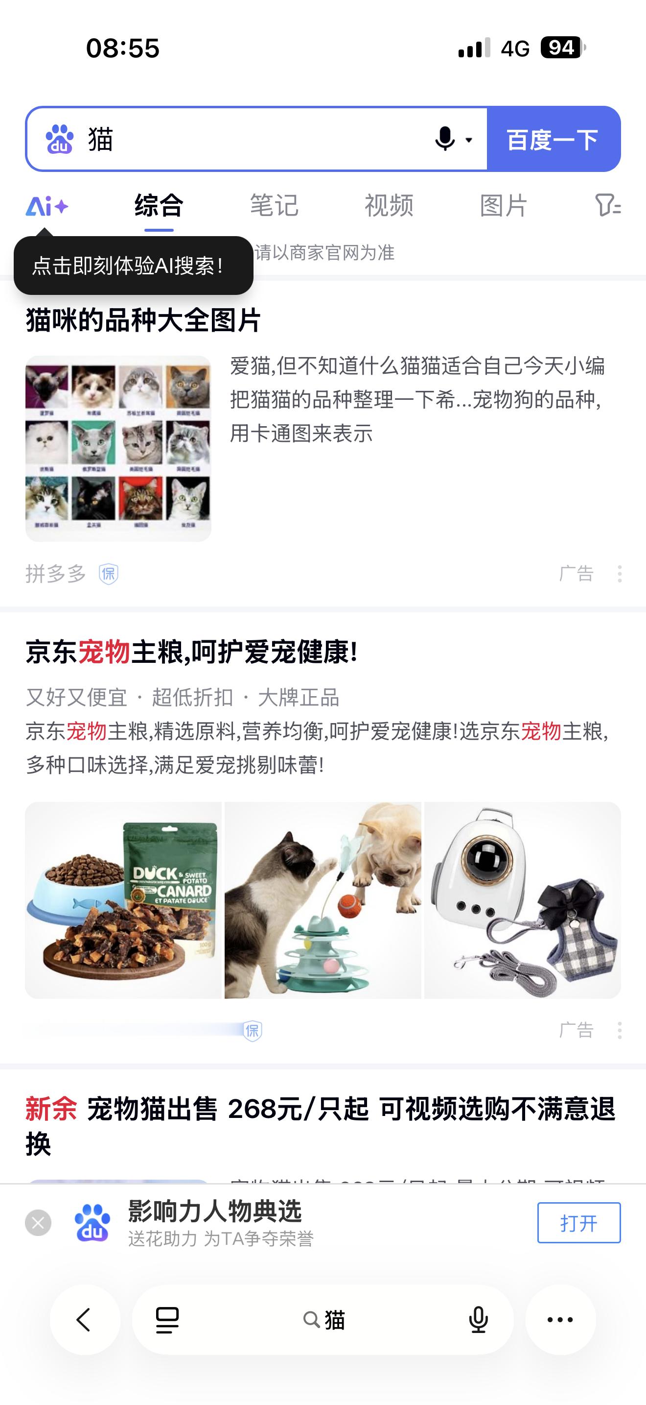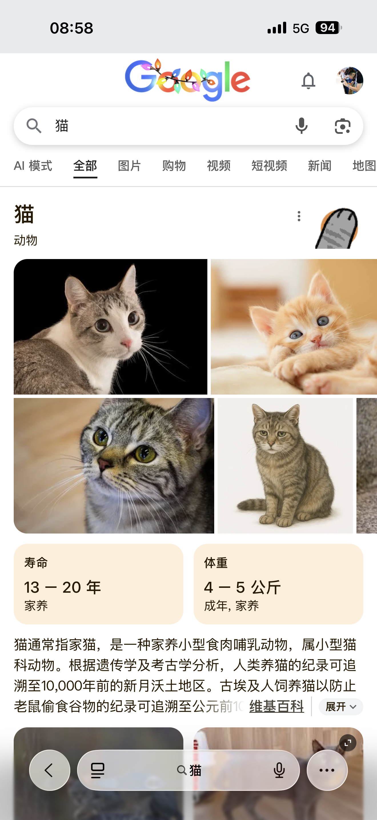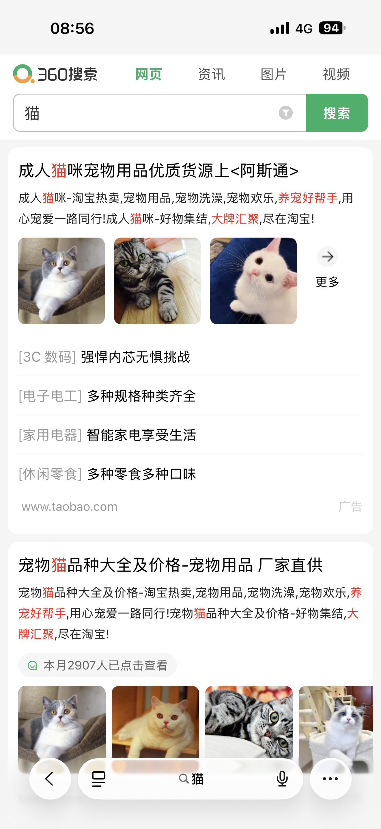 测了7个搜索引擎搜索“猫”,按顺序:必应、百度、搜狗、360、神马、Google、雅虎这是只有360废了啊,往下滑20条里只有一条跟搜索结果有关,其余19条全是广告推广。百度还有救,就是广告会占据前排,往下翻还是有实际内容的。 Google是最细节的,搜索后会在屏幕上出现一个大猫爪,当然不止搜索猫会这样,很多场景都有对应的动画,看来只有Google在认真的做一个优先服务用户的搜索引擎。