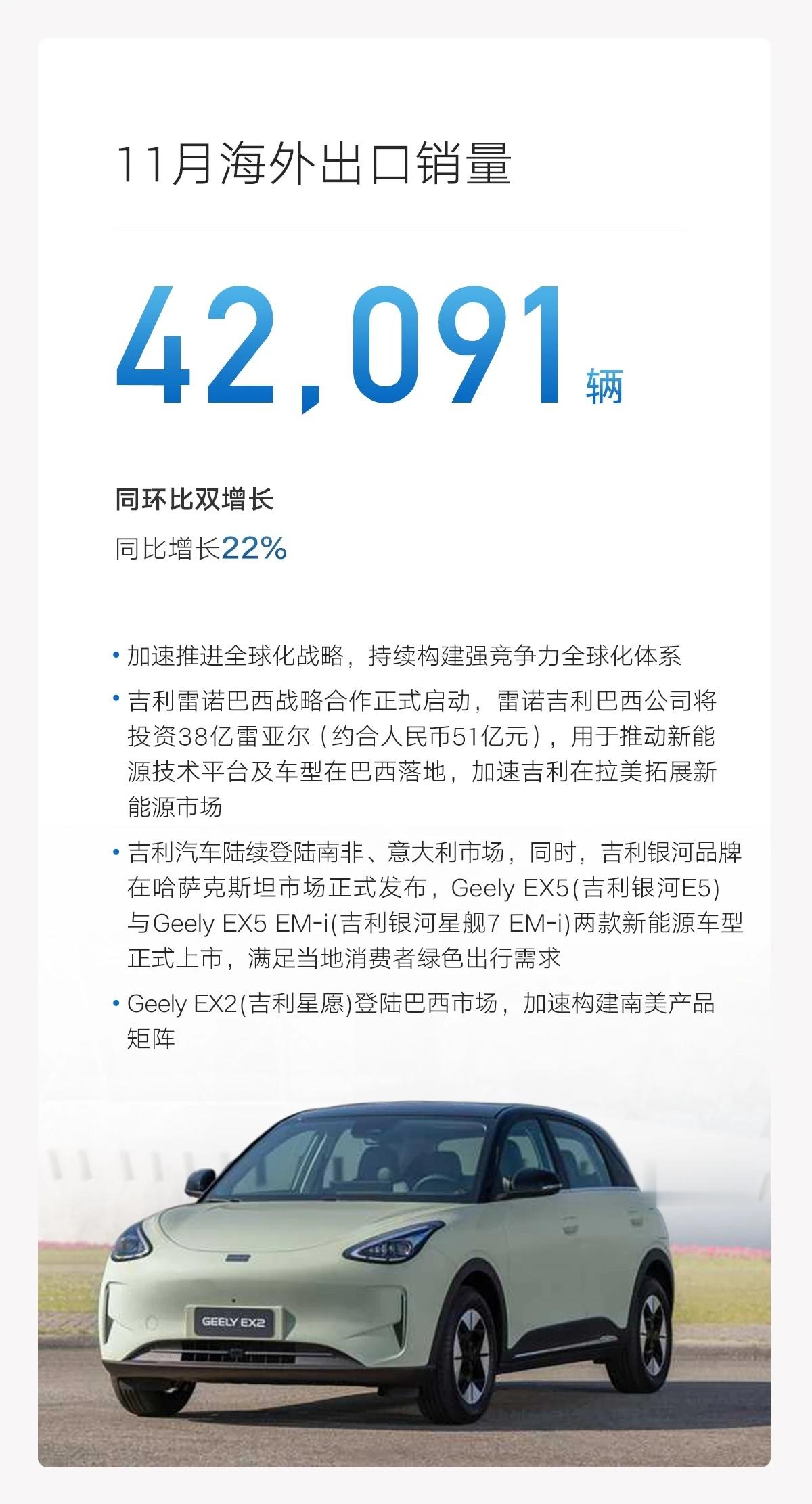 电车出海销量快报吉利汽车11月销量超31万辆再创历史新高,连续9个月同环比双增长。海外卖了4万多辆,同比增长22%,最近海外动作比较多:⚡吉利雷诺巴西战略合作正式启动,雷诺吉利巴西公司将投资38亿雷亚尔(约合人民币51亿元),用于推动新能源技术平台及车型在巴西落地,加速吉利在拉美拓展新能源市场;⚡吉利汽车陆续登陆南非、意大利市场,同时,吉利银河品牌在哈萨克斯坦市场正式发布,Geely EX5(吉利银河E5)与Geely EX5 EM-i(吉利银河星舰7EM-i)两款新能源车型正式上市,满足当地消费者绿色出行需求;⚡Geely EX2(吉利星愿)登陆巴西市场,加速构建南美产品矩阵。得以全球222万用户选择和支持,极氪科技单月销量持续突破6万台,11月销量63,902台,极氪11月销量28,843台,领克 11月销量35,059台。大v聊车吉利汽车