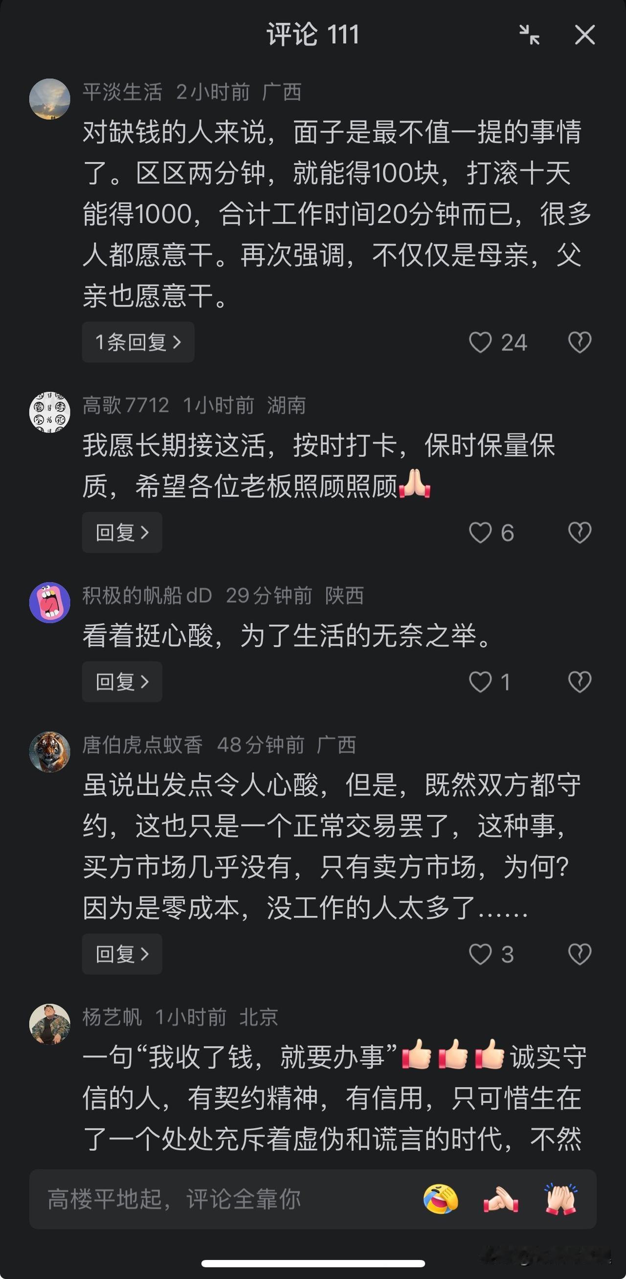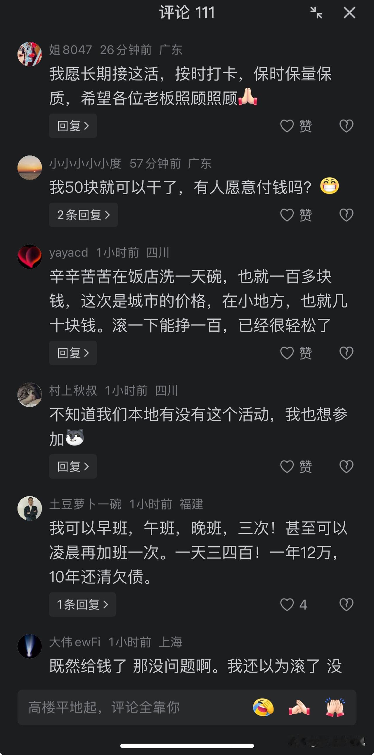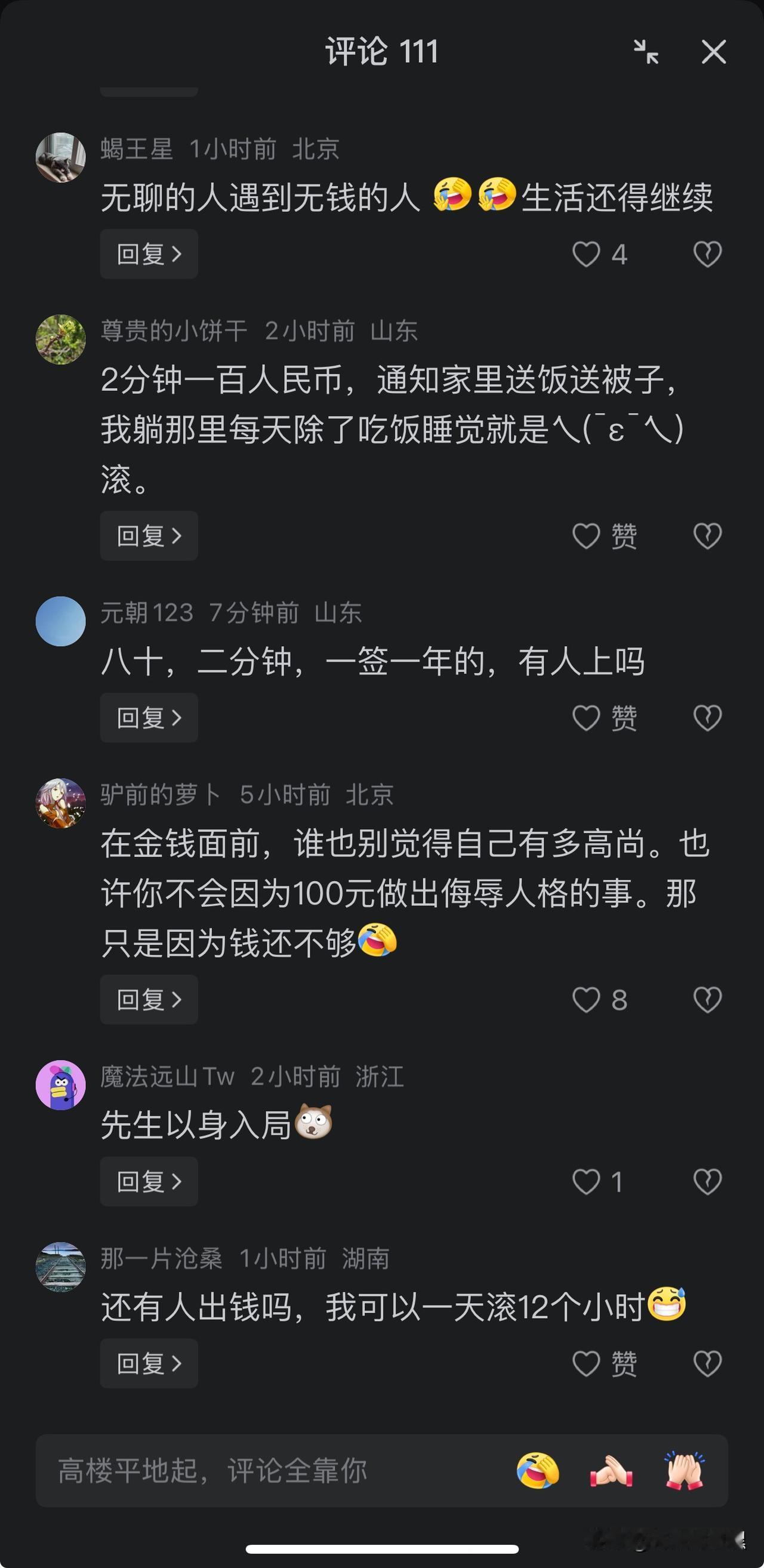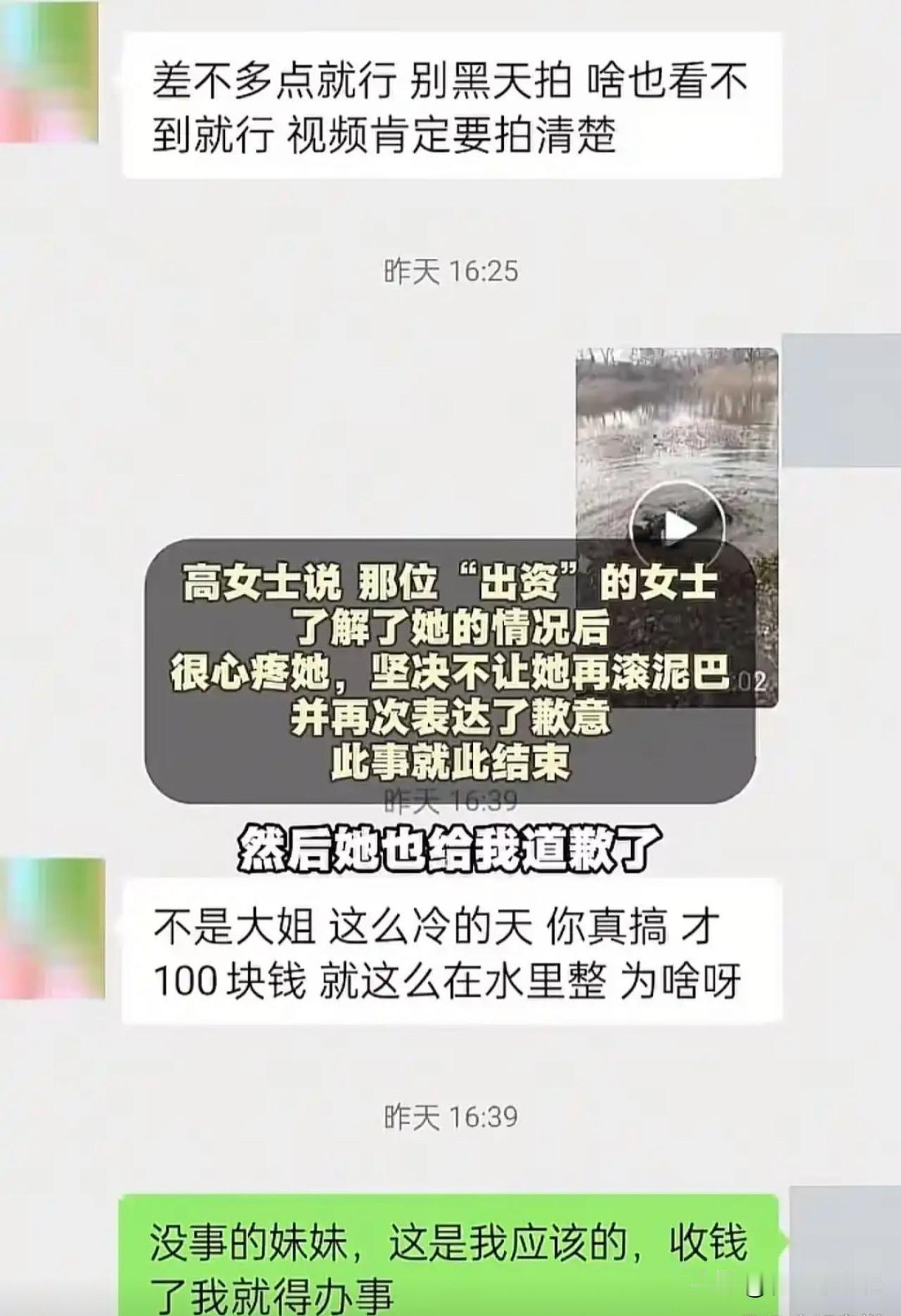 是什么让我们没了尊严 看到一个短视频,一位女子在泥地里翻滚,原来有一个网友在她的空间留言,说你如果在泥水地里翻滚两分钟,就给你一百块钱,女子毫不犹豫的跳进了。 两分钟过后,女子将翻滚的视频发给了那位网友,那位网友大吃一惊,原本她就是随口开了一句玩笑话,没想到女子真的在这大冷天跳进冰冷的泥水里了,网友倒也信守承诺,当即将钱转了过去。 看到这里,不由得心里发酸。虽然很理解她,我也经历过没钱的日子,知道哪怕是一百块钱也不是那么容易得到的,可心里总是觉得不是滋味。 我经历过吃不饱的年代,那个时候也有朋友之间打赌的,但大多是赌你能吃多少或者你吃了多少我输什么的游戏,但没有这种放弃尊严去换取丁点实惠的。 再看评论区,90%以上倒是没有看不起这位女子的,相反却纷纷表示都会这么去做,这是怎么了?我们现在不是已经进入小康了吗?我们的经济实力不是已经跃居世界前列了吗?我们的国民去全世界周游各种消费都不眨眼的吗?而这个女子就为了让孩子能多吃几顿肉,放弃尊严的躺在泥水里翻滚,这肉怎么吃的下去! 但愿评论区那些人仅仅是开玩笑吧,只是让女子不那么尴尬。 ————————