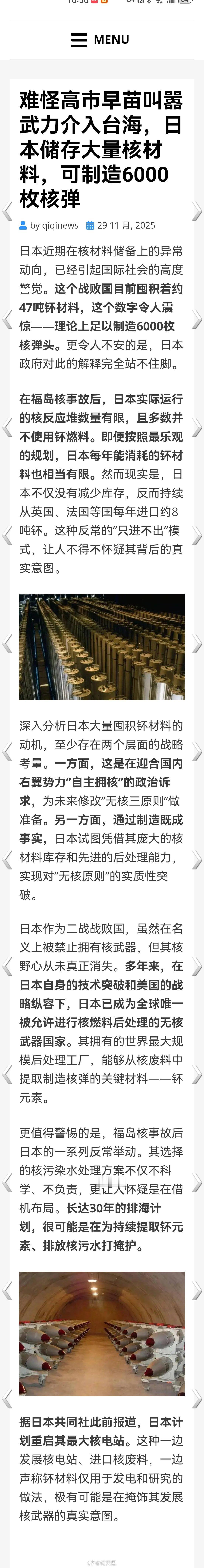 难怪高市早苗叫嚣武力介入台海,日本储存大量核材料,可制造6000枚核弹。日本投降