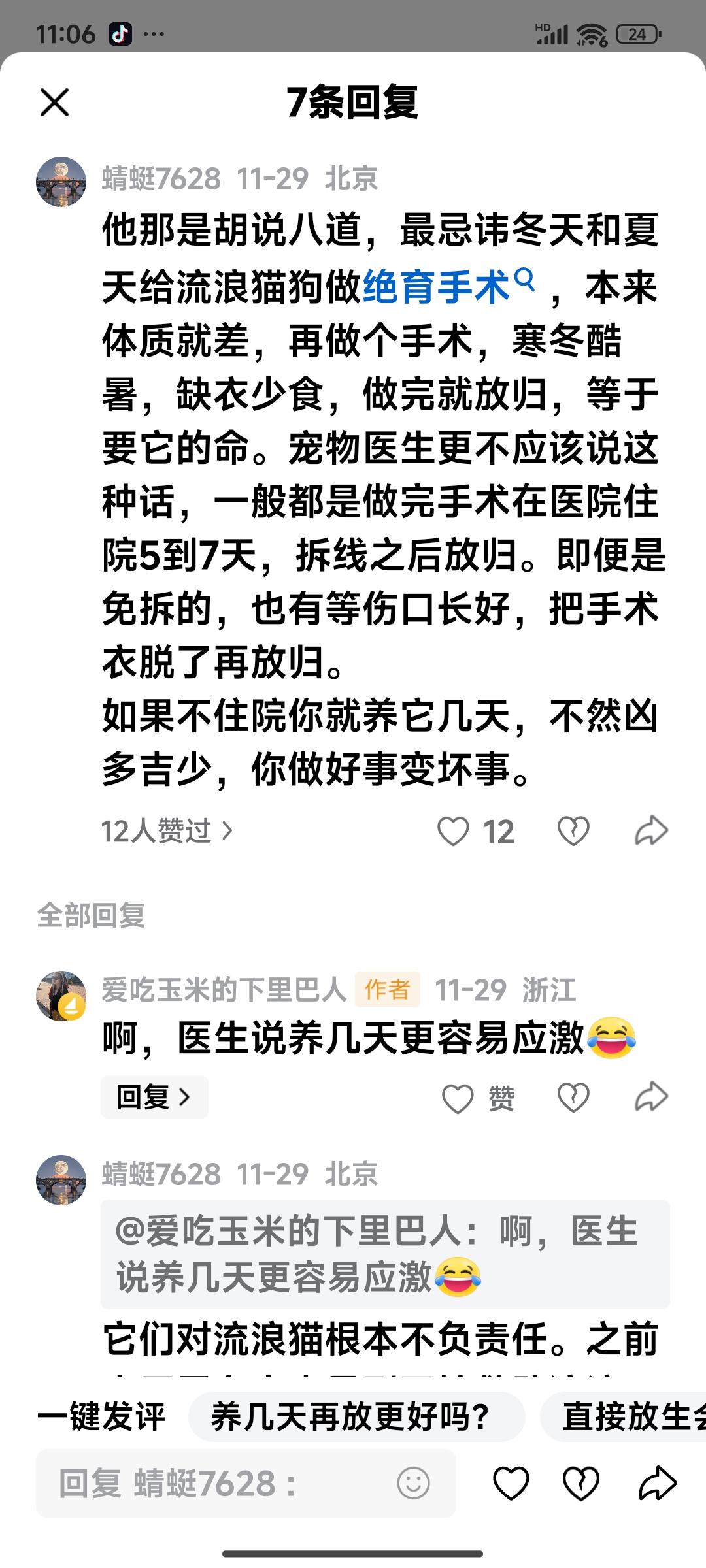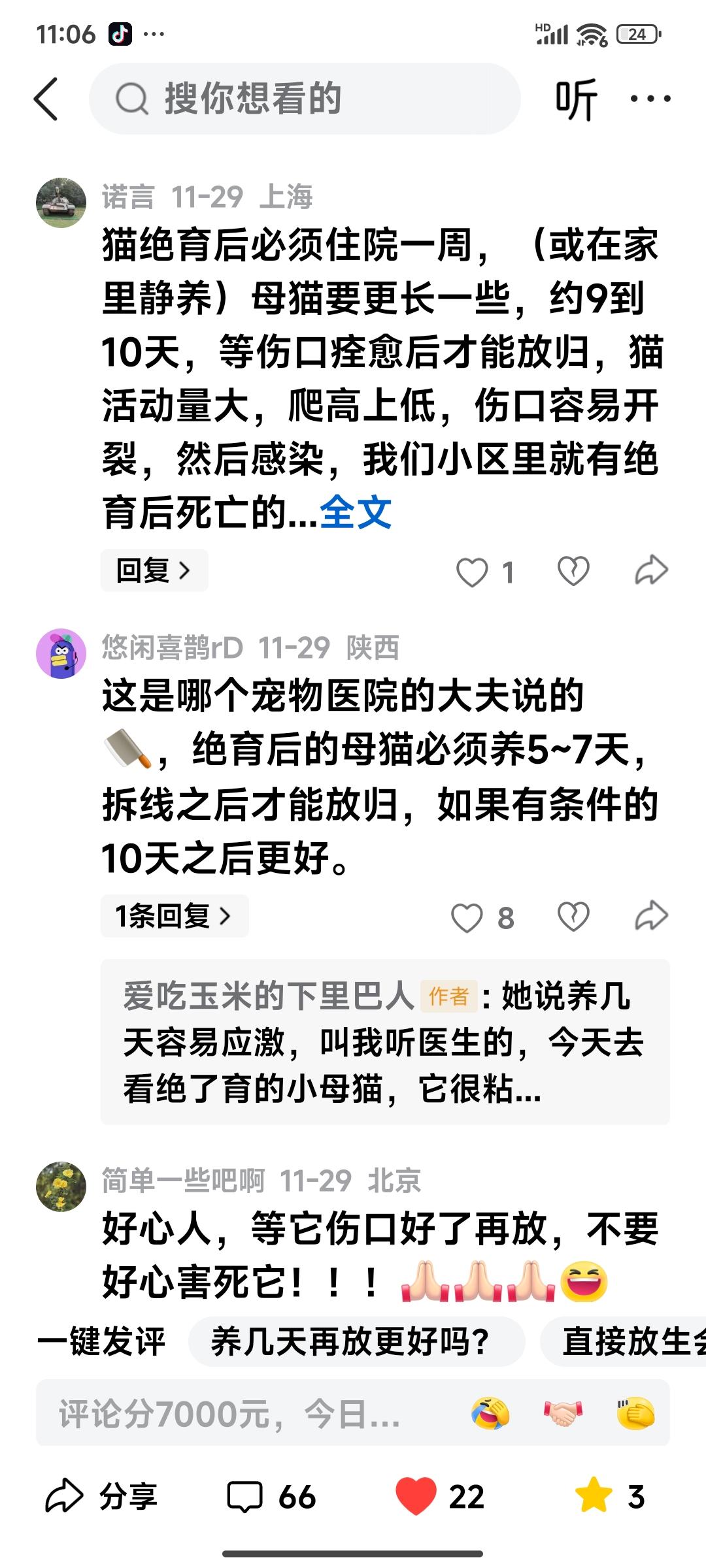 让大家担心了,那只刚做完绝育手术就放回大自然的小猫,已经恢复如初了,事实证明宠物医院的医生所言不虚。 三天前,我带这只小母猫做了绝育手术。当时我想着,刚做完手术的小母猫总得养几天,等伤口愈合后再放归大自然。 没想到医生说不用,并告知现在采用的都是微创手术,也打过止痛针,等一两个小时,麻醉药效过了就可以放归了。 医生还说,流浪猫最害怕不熟悉的环境,放回原来的地方,只要每天给它提供吃的,喝的,就行。 也不用拆线,绷带它自己会咬掉,给它补充点营养就行。 这可把网友们急坏了,大家觉得刚做完手术就放生,无异于要了猫的命。 确实,刚做完手术的前两天,它的确有些行动不便。到了第三天,身上的绷带已经掉了,它也恢复了往日的活泼,请网友们放心。