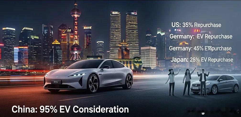 罗兰贝格最新的研究显示,全球主要汽车市场里,中国用户对电动车的接受度依旧“遥遥领先”。高达 95% 的消费者表示愿意考虑下一辆车买 EV。这个数字放在全球范围里,几乎没有可比性。再看看其他国家:美国的 EV 复购率只有 35%,德国更是出现“两极分化”,45% 愿意继续买,但整体 EV 复购意愿明显下降,日本更夸张,只有 25% 的用户愿意再买一辆电动车。说白了,在传统汽车强国里,电动车热度正在“退潮”,而在中国,它依旧是主流选择。这种差距反映的不是单一产品,而是产业生态的成熟度。基础设施、补能便利度、车机体验、价格梯度、供应链效率。这些东西叠在一起,才让用户形成“强意愿+高复购”的惯性。而在海外,任何一个链条不稳,都足以让消费者退一步。也正因为如此,中国品牌现在出海能跑得这么快不是偶然。你在欧洲、东南亚、中东、拉美看到的那一波“加速扩张”,背后靠的,就是这个在国内已经验证过的巨大用户池和完整产业体系。当中国有 95% 的用户愿意考虑 EV,而海外主要国家复购率普遍跌到 25%–35% 的时候,这不是市场情绪的差异,这是下一轮全球汽车格局变化的前奏。大v聊车电车出海新能源汽车