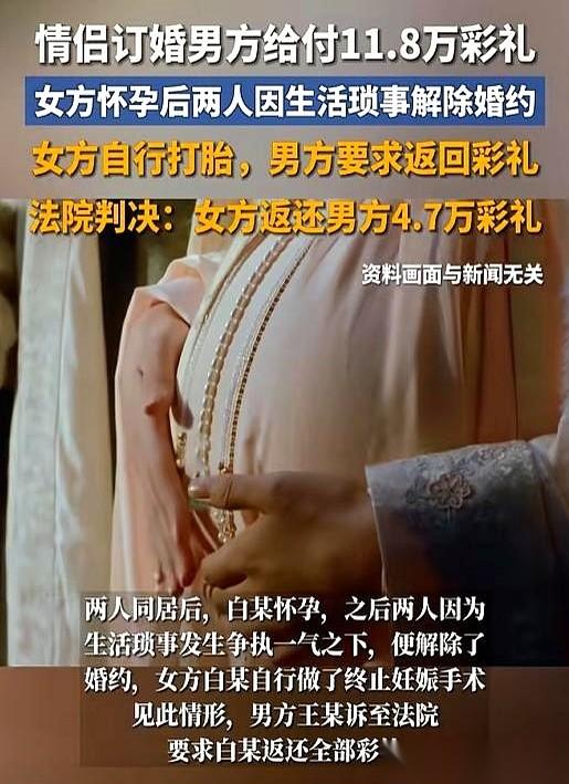 前未婚妻偷偷打掉孩子,男方一怒之下告上法庭,要求全额返还11.8万彩礼。 这事儿听着,就透着一股子凉气。 说白了,他到底是在为那个没出生的孩子愤怒,还是在心疼那笔钱? 当初订婚,十好几桌的酒席,金项链金手镯,风风光光,恨不得让全世界都知道“我们是一对了”。 婚房也住了,夫妻日子也过了。 结果呢?为点鸡毛蒜皮的小事,谁洗碗,工资卡谁拿着,吵崩了。 年轻人嘛,气头上,谁也不让谁,“散就散”,话说得比刀子还快。 分手就分手吧,结果女方发现自己怀孕了。 她怎么想的?可能是委屈,可能是绝望,反正她没告诉男方,自己一个人去医院,把孩子拿掉了。 这事儿换谁都得炸。 但男方接下来的操作,才是最让人心里五味杂陈的。他直接一纸诉状,核心诉求就一个:钱,一分不少地还给我。 他觉得,我给了彩礼,是奔着结婚生子去的“投资”,现在“项目”黄了,本金得全回来。 他把一段感情,一个没来得及看世界的生命,清清楚楚地折算成了11万8。 那一刻,所有的情分,都变成了冷冰冰的账本。 幸好,法官不是会计。 法院没让他全额拿回去,判了返还四万七。 为什么?因为法官看到了钱背后的人。 看到了他们确实在一起生活过的日子,看到了女方身体和精神上实实在在的伤害。这个伤害,是钱买不回来的。 法院的判决,其实是在说一句话: 对不起,人的感情和身体,不能简单地用彩礼的数额来对冲。她受的罪,得算数。 这哪是判了个案子,这简直是给所有把婚姻当交易的人,上了一堂最贵的课。