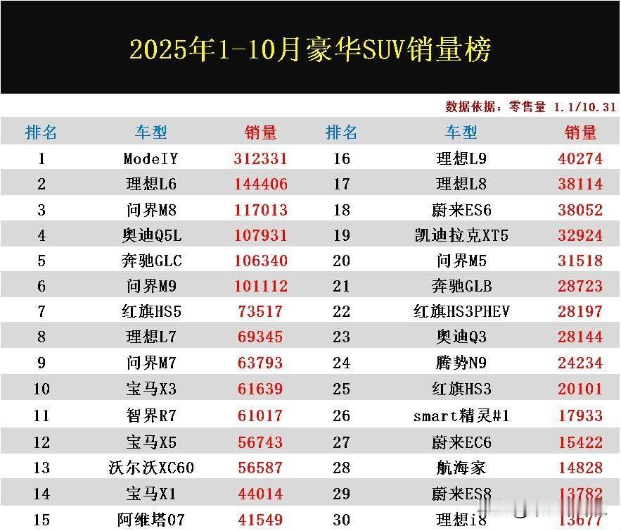 豪华品牌SUV市场大变天了,新能源车型简直无敌了!刚刚无意间看到这份2025年1-10月豪华SUV销量排行榜,属实让人感到意外,这新能源车型不仅包揽了榜单前三名,而且前十名里面还占据六款之多,销量完胜传统燃油车。 第一名特斯拉ModelY销量31.2万辆。 第二名问界M8销量14.4万辆。 第三名问界M8销量11.7万辆。 值得一提的是,传统豪华品牌三强只有奔驰GLC以及奥迪Q5L累计销量勉强破10万辆,而宝马旗下的车型销量都不及巅峰时期,无一款超10万辆,销量最高的宝马X3仅售出了6万多辆。