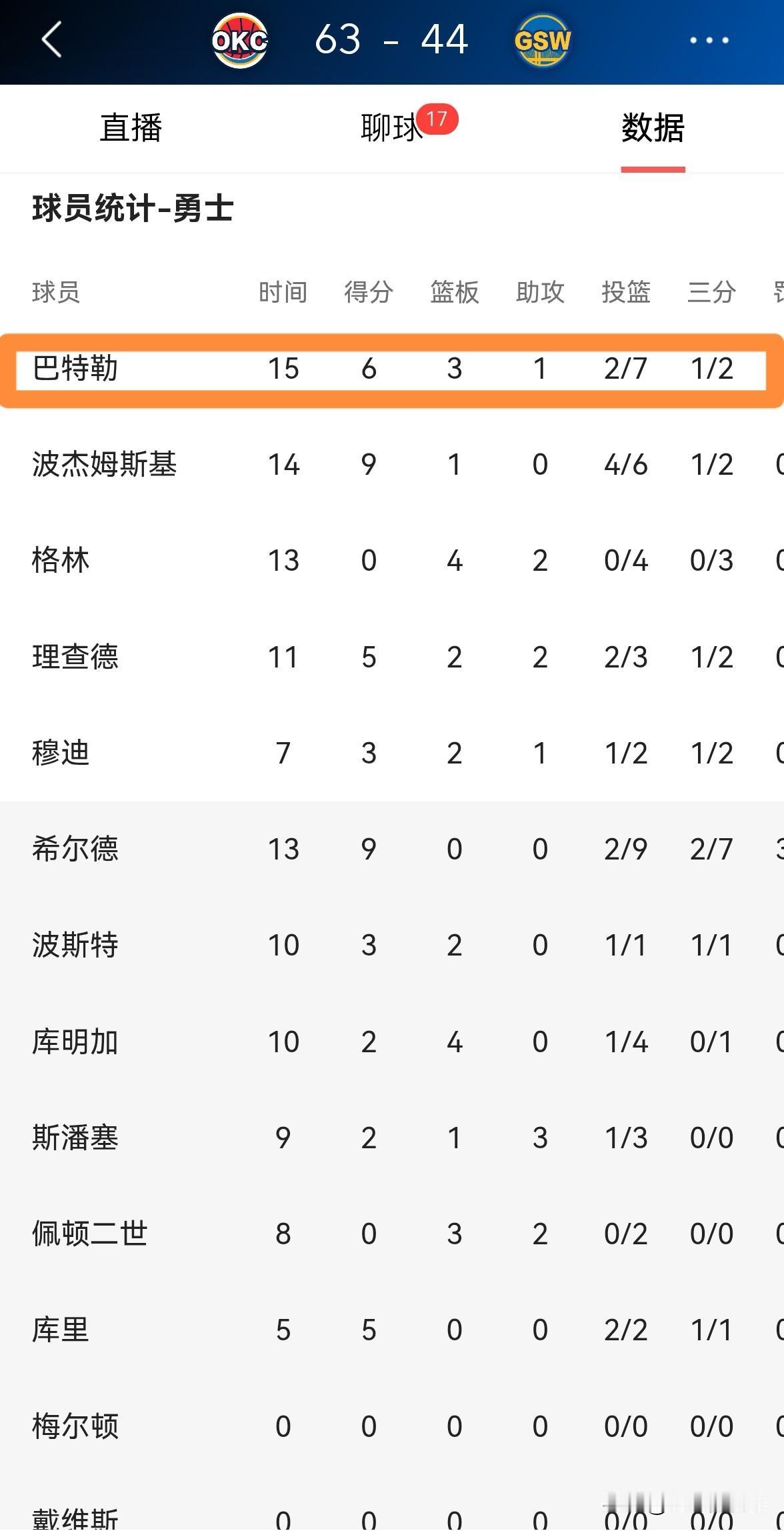 勇士超级球星巴特勒真是出工不出力!今天勇士在主场迎战雷霆,目前双方的上半场比赛已经结束,勇士以44:63落后雷霆多达19分。毫不夸张的说,巴特勒绝对是勇士大比分落后于对手的罪魁祸首,他在前两节比赛中完全是出工不出力。 在上半场比赛中,巴特勒首发出战15分钟,投篮7中2,其中三分球2中1、罚球1中1非常低效的得到6分,他的场上正负值为-13。 作为球队的领袖和核心,巴特勒在上半场比赛中的表现真是糟糕透顶。