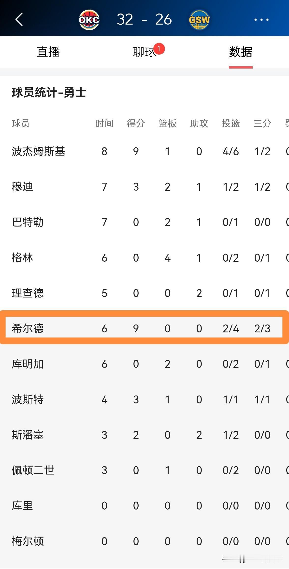 勇士神射手希尔德终于发挥正常了!在今天勇士主场迎战雷霆的比赛中,目前双方的第一节比赛已经结束,勇士以26:32落后于对手。在首节比赛中,希尔德替补出战6分钟,三分球3中2、罚球3中3爆砍9分。 不出意外的话,以希尔德目前的滚烫手感来看,我预感本场比赛希尔德会迎来大爆发。