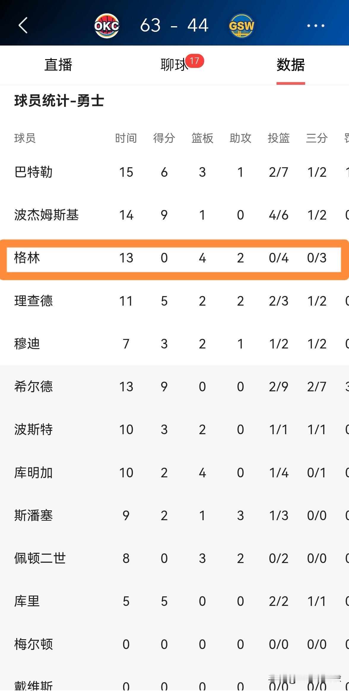 勇士老将追梦格林真是烂透了!在今天勇士主场迎战雷霆的上半场比赛中,追梦格林毫无取胜欲望和斗志,他在首发出战的13分钟里,投篮4中0,其中三分球3中0怒砍0分,还有3失误和3犯规,他的场上正负值为全队最低的-15。 如果用一句话来描述追梦格林在上半场比赛中的表现,那就是他压根不想打球。